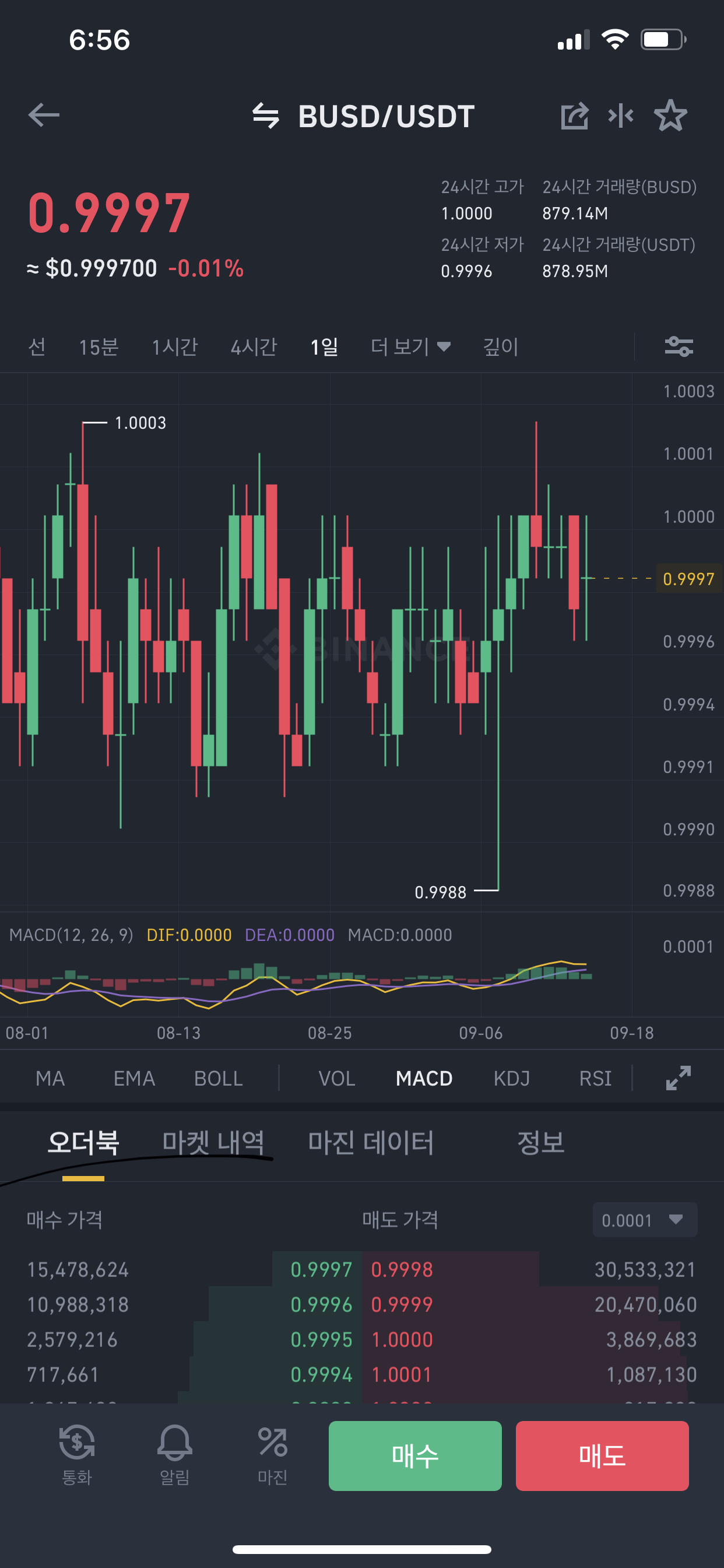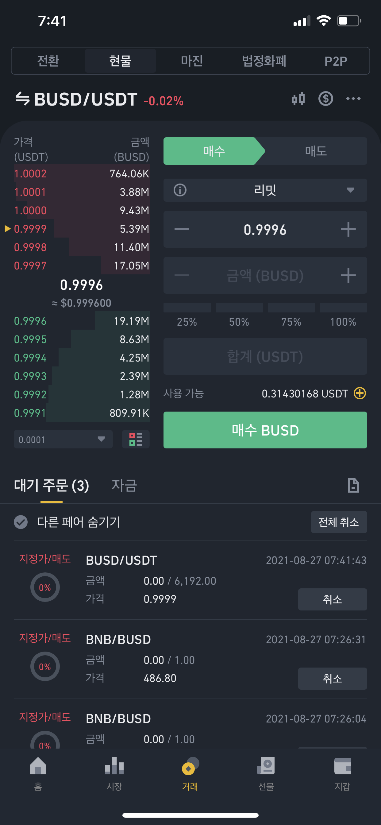 BUSD/USDT 거래페이지를 이동하면, 본인이 갖고 있는 BUSD를 USDT로, USDT를 BUSD로 교환할 수 있습니다. 차트를 보시면, 스테이블코인인데도 가격변동이 미세하게 있는것을 보실 수 있습니다. 스테이블 코인임에도 이런 차트가 발생하는 이유는 특정 스테이블코인에 대한 수요가 상황에 따라 시시각각 변경되기 때문입니다. 급하지 않다면 1.000에 예약 매수/매도를 걸어두면 몇일 내에 체결되는 것이 보통입니다.