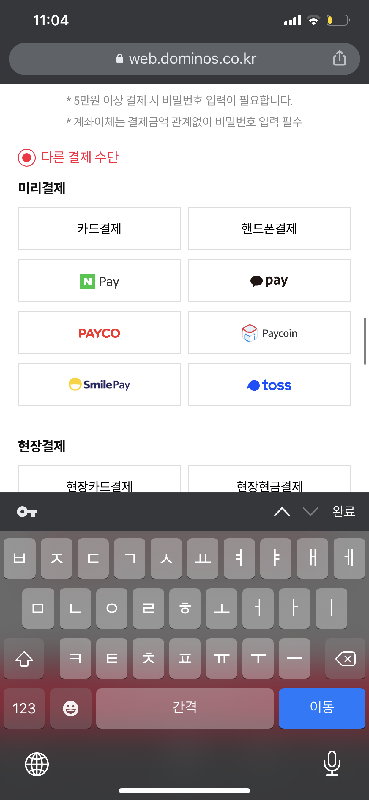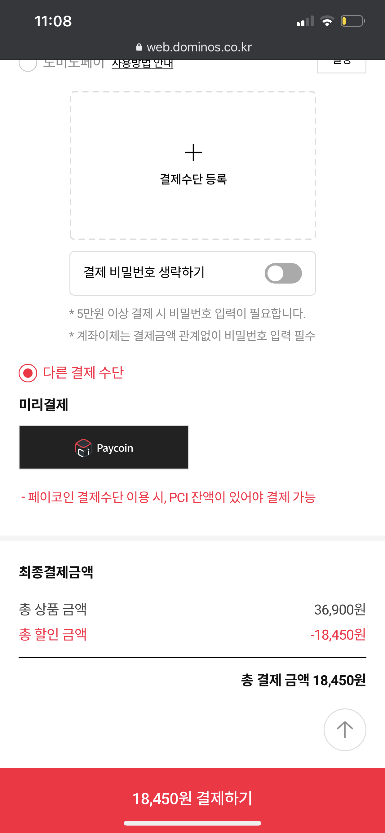 저는 도미노피자 웹페이지에서 로그인을 해서 주문을 했어요. 50% 배달주문 할인 적용은 [카드사 제휴 할인] 옵션에서 [페이코인 배달 50% 할인]을 선택해서 할인 적용할 수 있었어요.