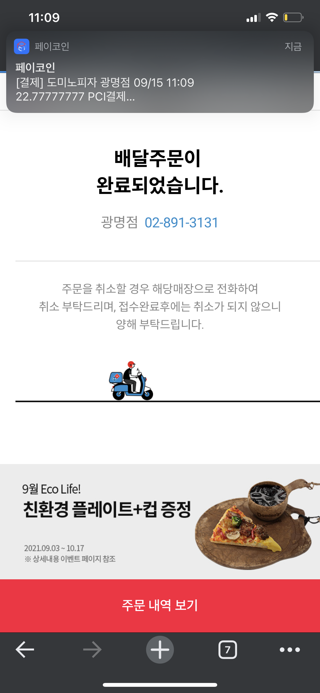 배달료 포함가격에서 50%를 할인받아서 그런지, 생각보다 할인율은 더 크게 적용받았네요. 이렇게 피자를 50%할인받아서 주문할 수 있었어요. 동생, 어머니랑 같이 피자를 먹을거라 라지로 주문했읍니다.