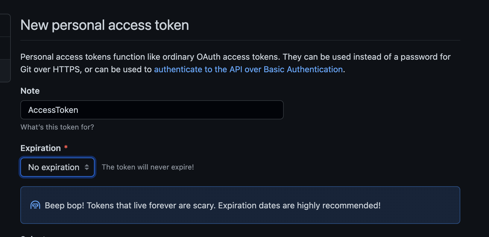 생성할 토큰의 이름과 만료일자를 선택해줍니다. 만료일을 지정하면 해당 만료일까지만 해당 토큰이 유효하게 동작합니다. [No expiration]을 선택해주면 만료기간이 없이 사용가능하지만, 만료일자가 없기에 주의해서 사용하라는 문구가 아래에 나오네요.