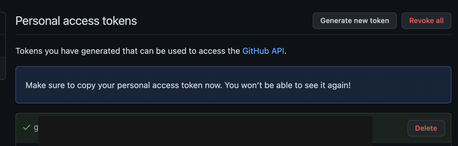 그렇게 Personal access token을 만들어주면 위 화면과 같이 Personal access tokens 리스트에 생성한 토큰이 보일거에요. 여기에서 토큰 비밀번호를 복사할 수 있습니다. 원격저장소 push 문제 해결을 위해서 해당 토큰 비밀번호를 복사해주세요.