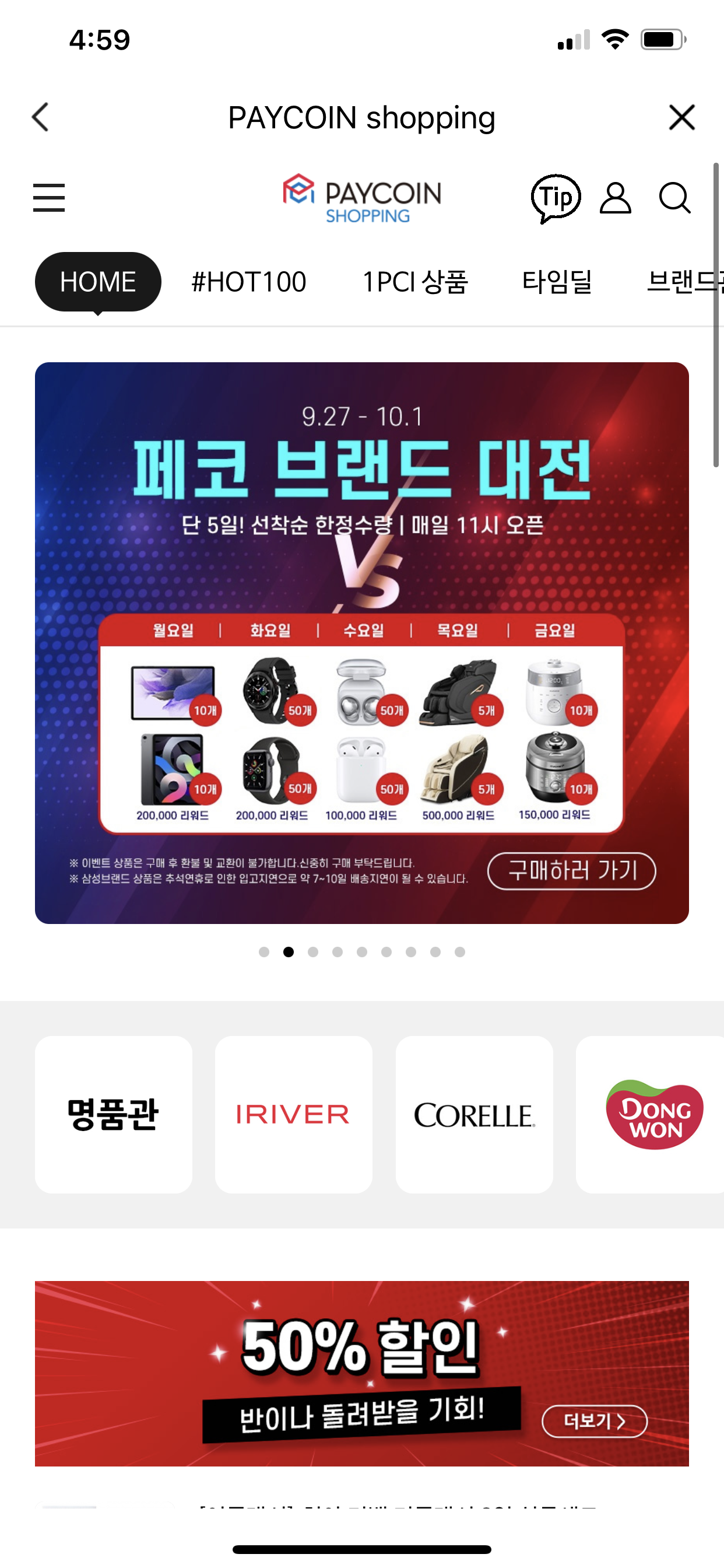 판매하는 상품은 이벤트기간 내 1인 1개만 판매가 가능하며, 할인된 금액은 페이코인으로 페이백 지급하는 방식입니다. 페이백이 지급될때 페이코인 가격에 따라서 자산변동이 있을 수 있으니 이점 고려해서 이벤트를 참여해야 겠습니다. 매일 오전 11시에 판매를 시작한다고 하는데요. 구매 페이지는 어떻게 가야 할지 알아보겠습니다.