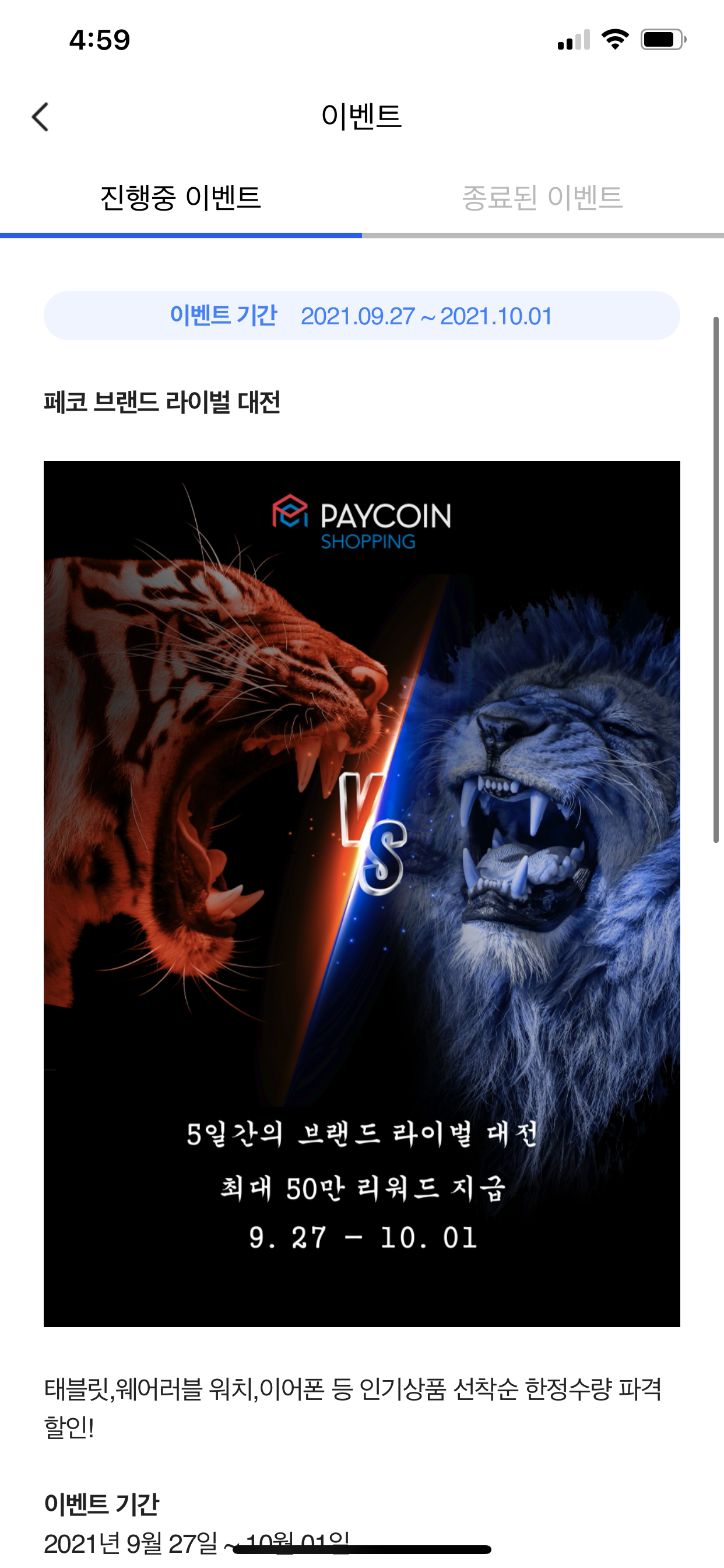 매일 상반된 성격의 브랜드 제품을 할인가에 판매, 할인된 금액을 페이코인으로 페이백해주는 이벤트입니다.