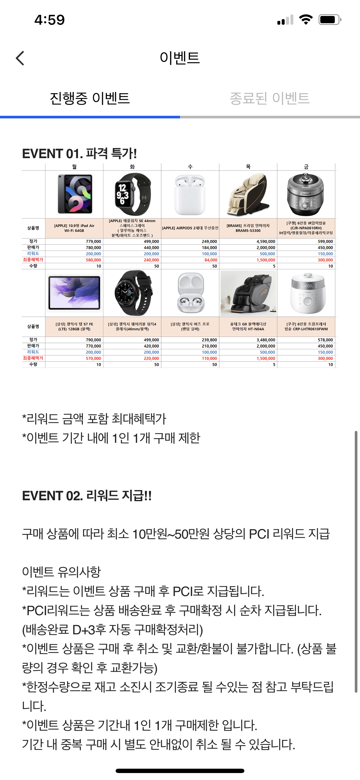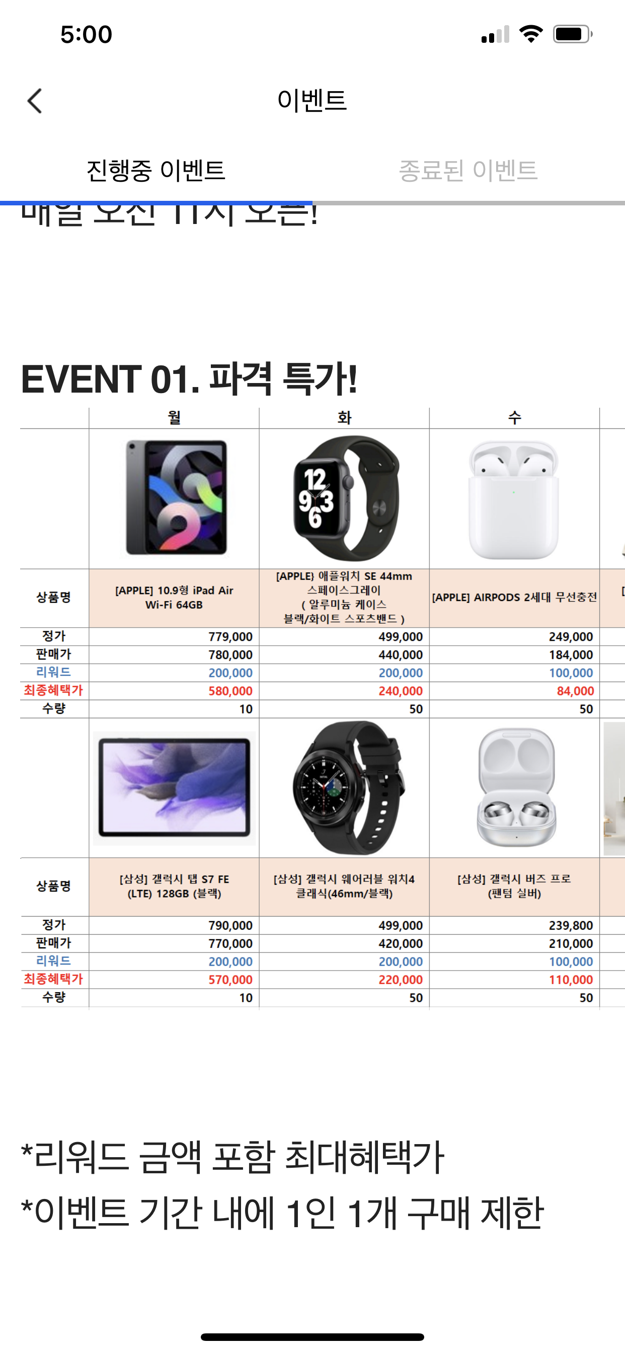 위 상품 리스트가 매일 파격가 세일을 하는 상품입니다. 매일 두개의 상품을 판매하는데, 애플/안드로이드 제품을 각 1개씩 판매하는 모습입니다. 매일 판매하는 상품의 할인율은 차이가 있으니 참고해서 참여할지 결정하시면 되겠습니다.