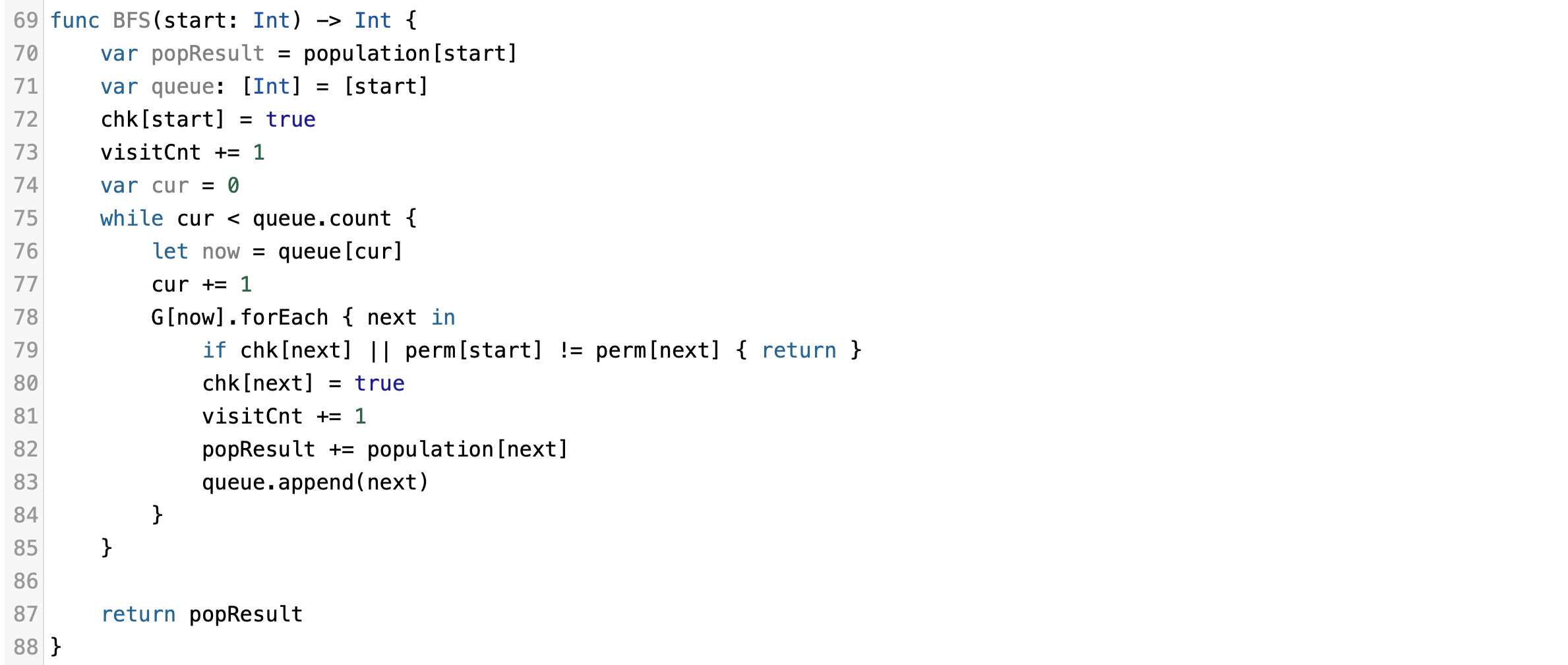 48 ~ 62행) DFS로 돌린 모든 경우의 수에 대해서 각각 선거구가 2개로 나뉘어지는지, 이때 모든 구역이 방문이 가능한지를 체크합니다. 구역 별로 BFS를 돌려서 각 선거구에서 인접한 구역들을 방문해주면서 방문한 구역의 수, 생기는 선거구의 수를 확인합니다.