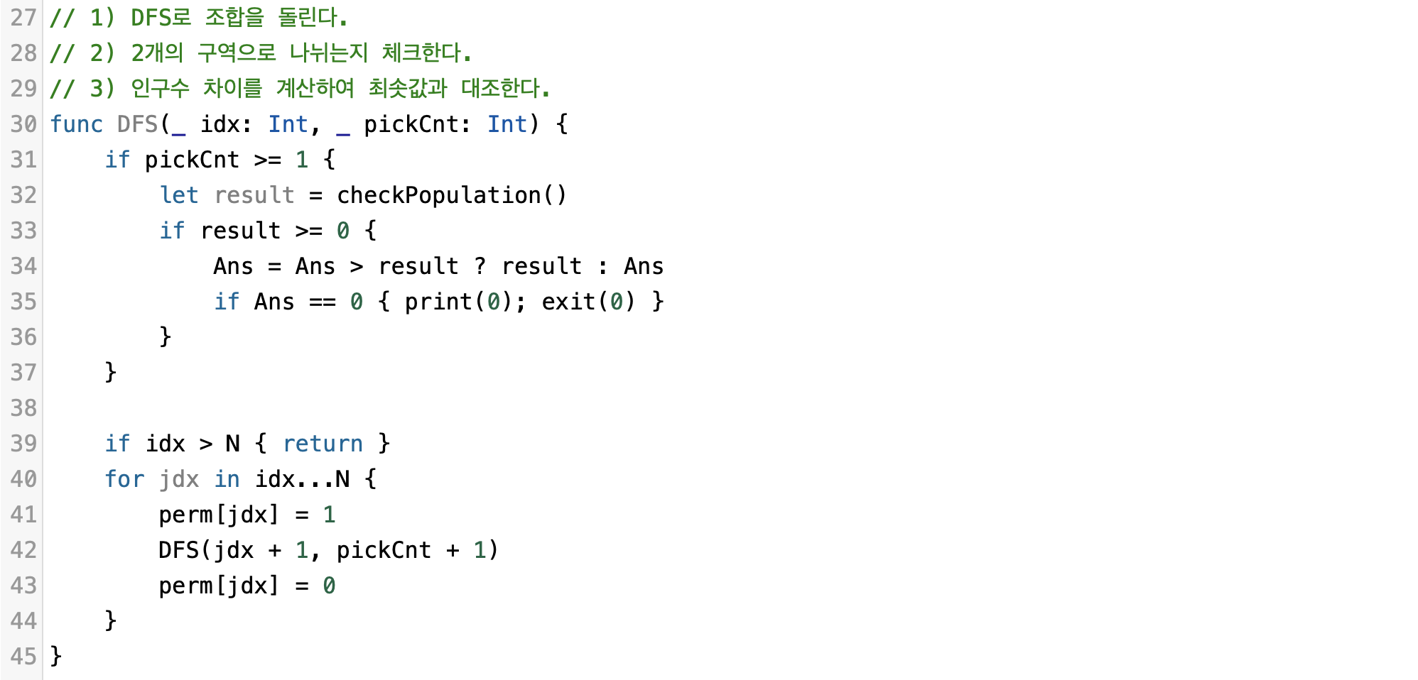27 ~ 29행) 말그대로 구현할 로직을 주석으로 순서대로 정리했습니다. DFS로 모든 경우의 수 조합을 만들며 각 경우의 수에 대한 선거구 분리 가능 여부, 선거구 간 인구수 최솟값을 도출합니다.
