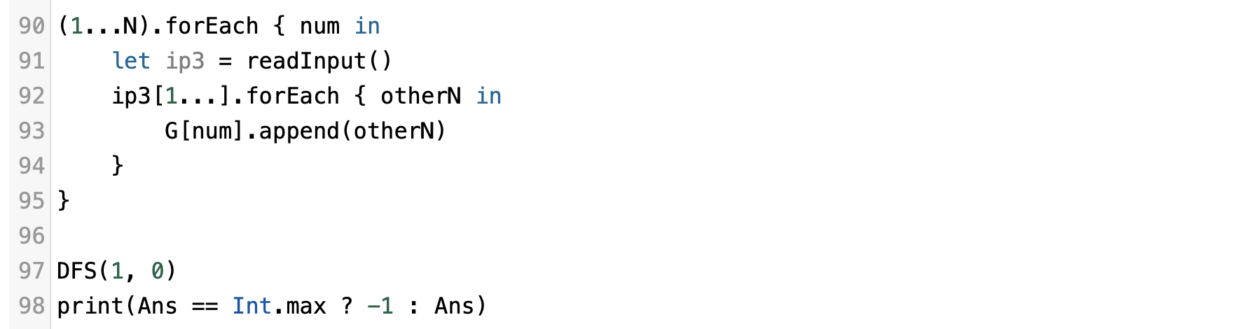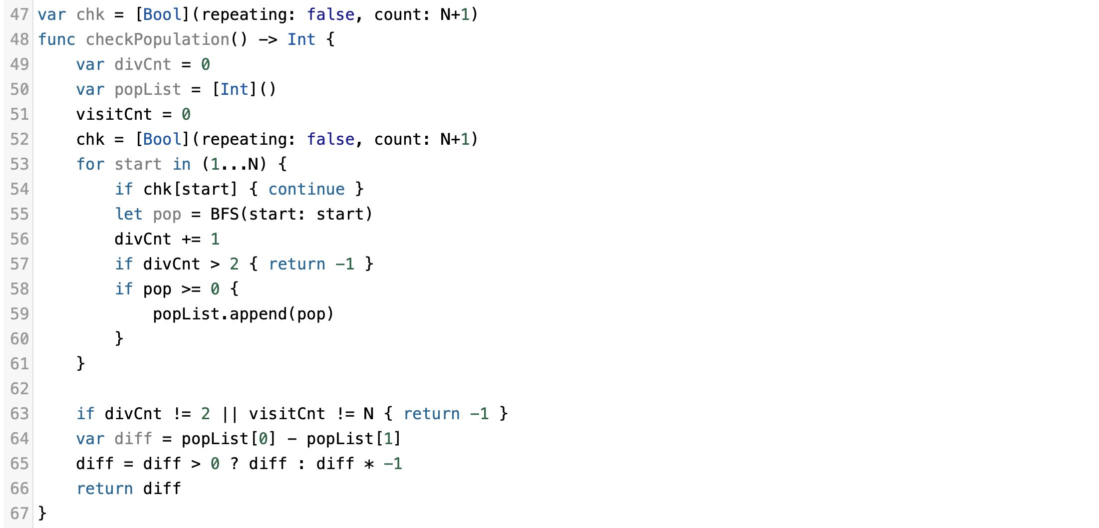 앞서 구현했던 readInput 클로져를 사용해서 입력을 받고, G 이차원배열을 구성해줍니다. 이후 DFS로 구역이 나뉠 수 있는 모든 경우의 수를 돌려서 선거구 간 인구수 차이 최솟값을 도출합니다. 만약 Ans값이 여전히 Int.max라면, 이는 선거구를 두개로 완벽히 나누는 경우의수가 없음을 의미하므로 -1를 출력해줍니다.