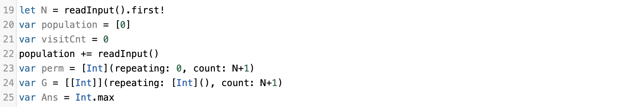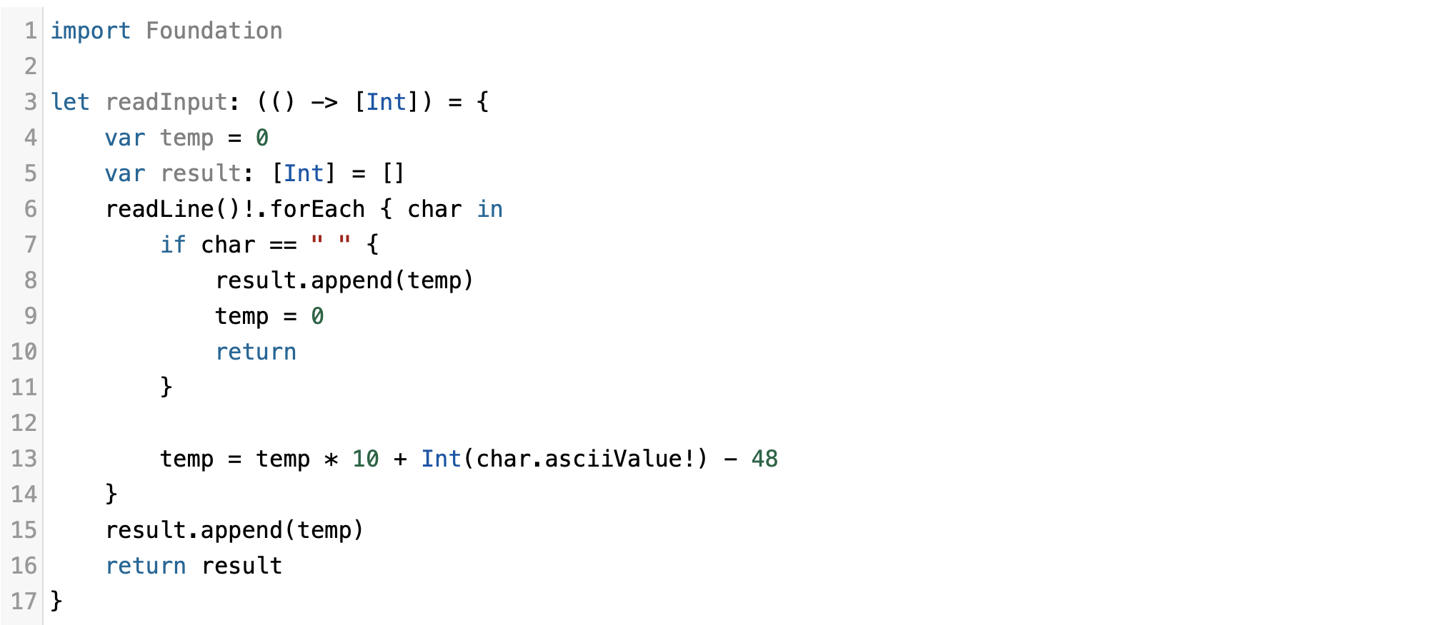 먼저, 입력받기전, readLine() 입력 속도 최적화를 살짝 진행한 readInput 클로져 함수를 정의해두었습니다. 위 클로져는 양수값만 입력으로 들어올때 사용할 수 있습니다. 음수도 들어가는 경우, "-" 문자에 대한 flag 예외처리도 진행해야합니다. 본 문제에서는 양수 Int값만 들어오므로 위 코드로도 충분합니다.
