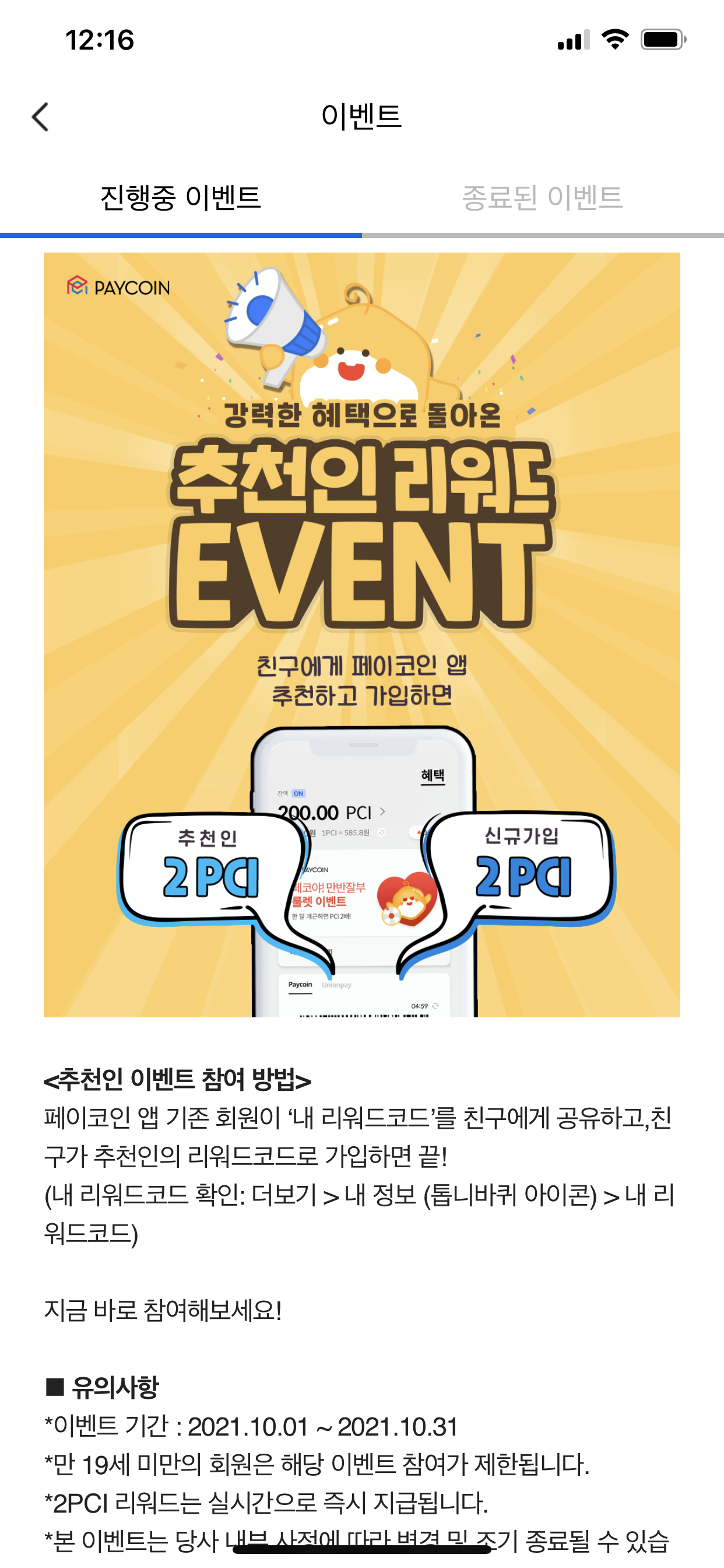 현재 페이코인앱에서는 추천인 리워드 이벤트를 진행하고 있습니다. 추천인 코드를 통해 가입하면 추천인과 가입자 모두 2개의 페이코인을 받게 되는 이벤트입니다.