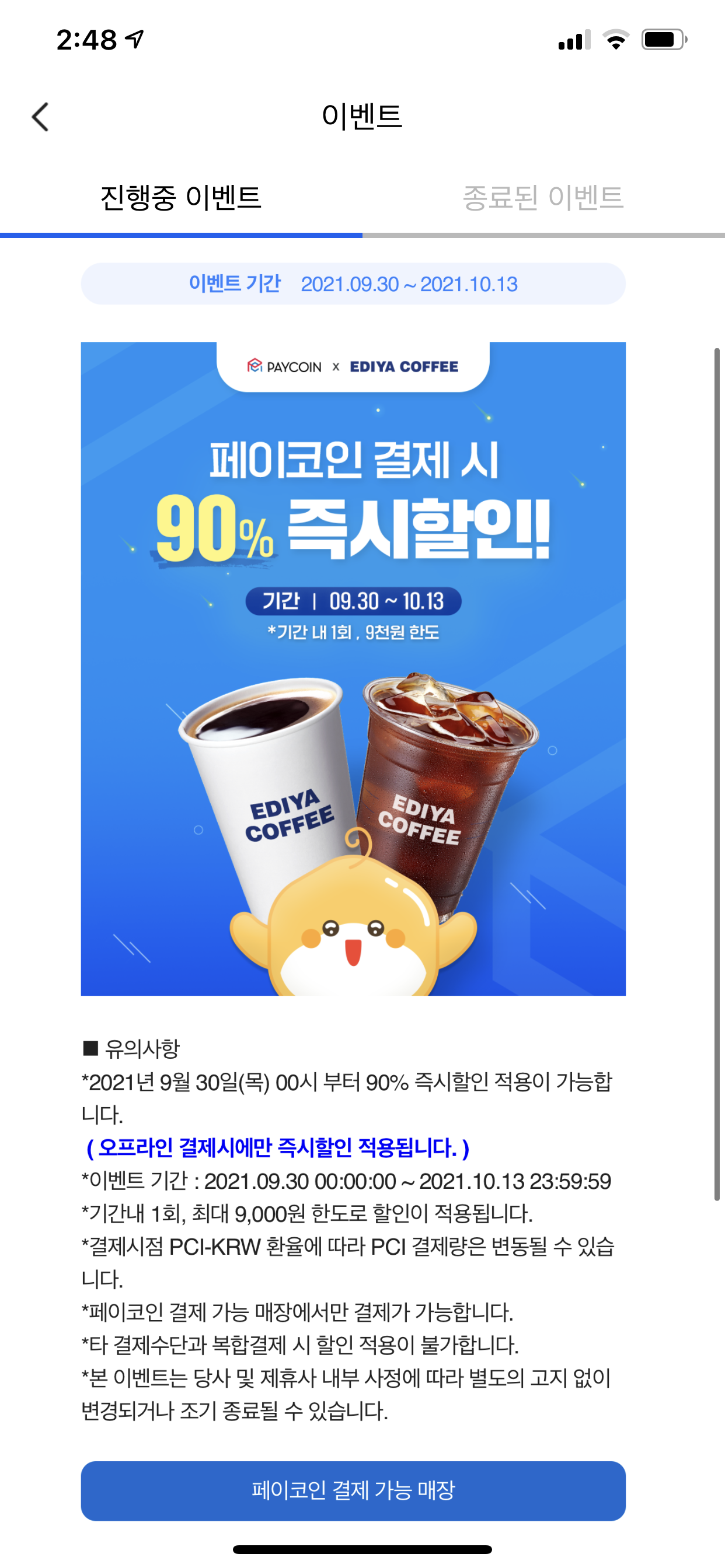 할인은 2021년 10월 13일까지 진행되고, 대부분의 이디야커피 매점에서 페이코인 결제를 하실 수 있는데요. 무료 90%, 9천원 한도의 할인을 해줍니다. 이를 추천인 이벤트로 받은 페이코인 2개로 충분히 활용하실 수 있습니다.