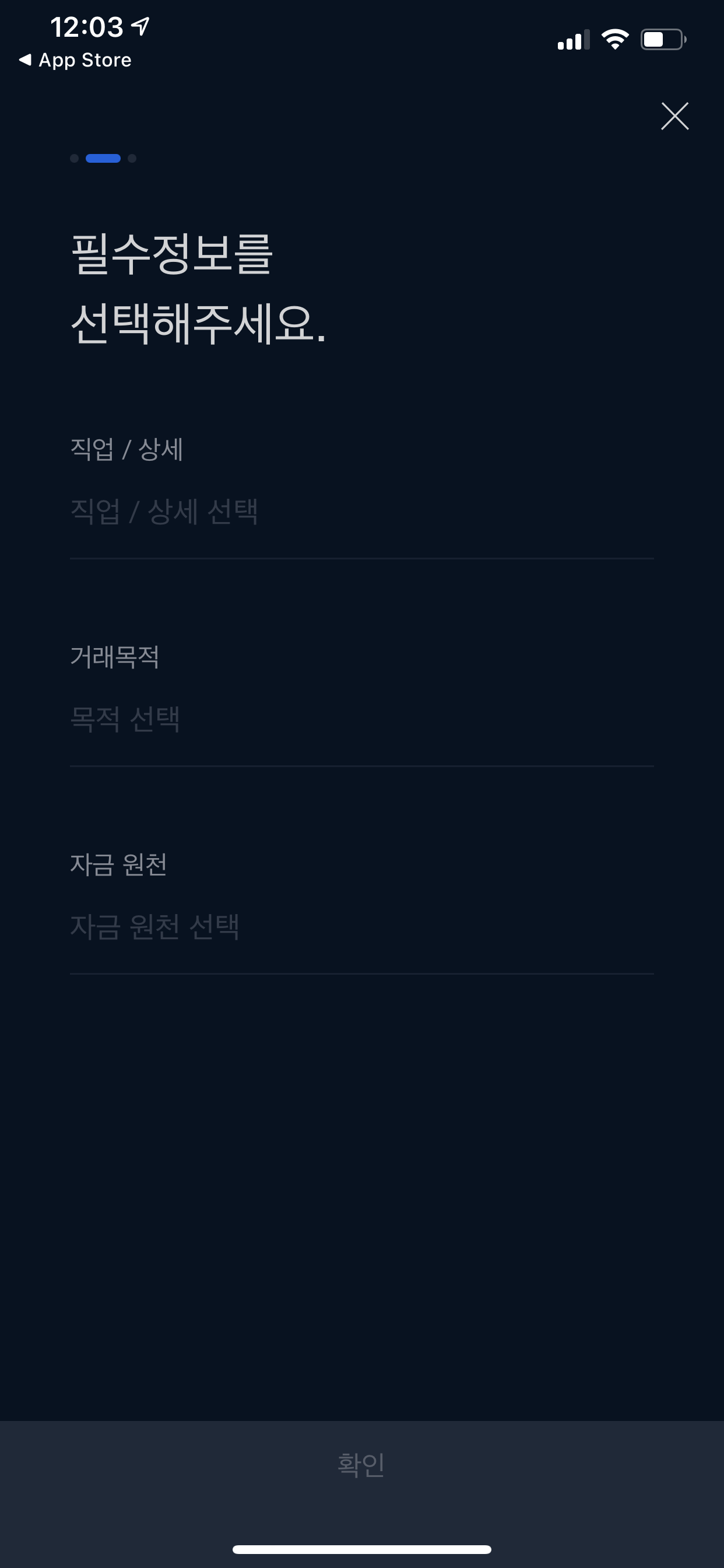 본인 이름, 이메일 등의 입력을 한 후 다음 화면에서는 직업, 거래목적, 자금 원천 등을 묻습니다. 솔직하게 작성 후, 확인을 눌러주시면 됩니다.
