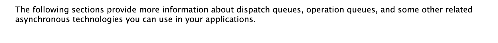 다음 이어지는 섹션들은 디스패치큐(dispatch queues), 오퍼레이션큐(operation queues), 그리고 그 외 다른 관련된 당신의 앱을 위해 사용가능한 비동기적 기술들을 제공합니다.