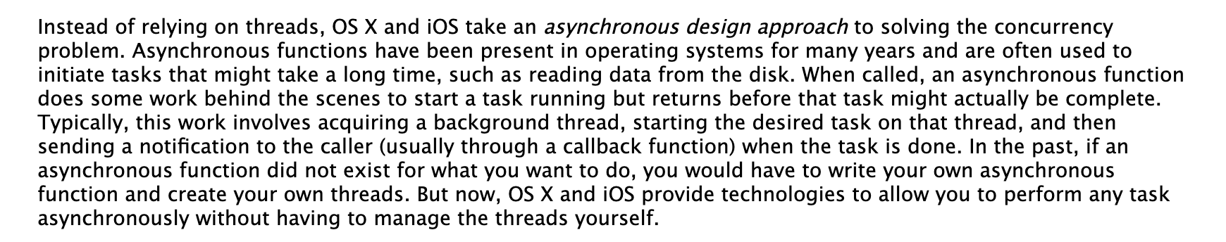 스레드에 의존하는 대신, OS X, iOS는 동시성문제를 해결하기 위해 비동기적인 설계 접근방식을 취합니다. 비동기 함수들은 운영체제 내에서 수년간 존재해왔으며 디스크를 통해 데이터를 읽는 등의 장기간 소요가 예상되는 작업을 시작하기 위해 자주 사용되었습니다. 비동기함수가 호출될 때, 비동기 함수는 작동을 위해 화면 뒤에서 일을 하게 되는데 실제로는 완료되기 전에 함수는 반환을 하게 됩니다. 전형적으로, 이 작업은 백그라운드 스레드를 만들고, 원하는 동작을 스레드에서 시작하고, 작업이 완료되었을 때 (보통 콜백함수를 통해) 호출자에게 알람을 전송합니다.
