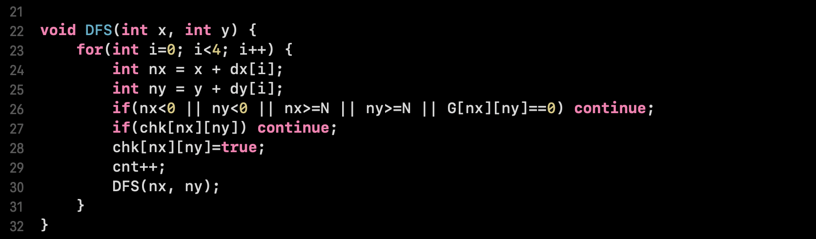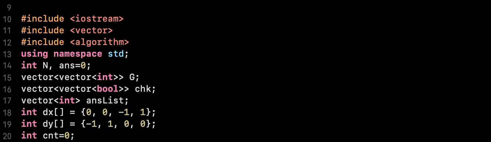 19 ~ 20행) 상하좌우 방문에 사용할 좌표정보 dx, dy와 방문횟수 카운팅용 변수 cnt도 선언했습니다.