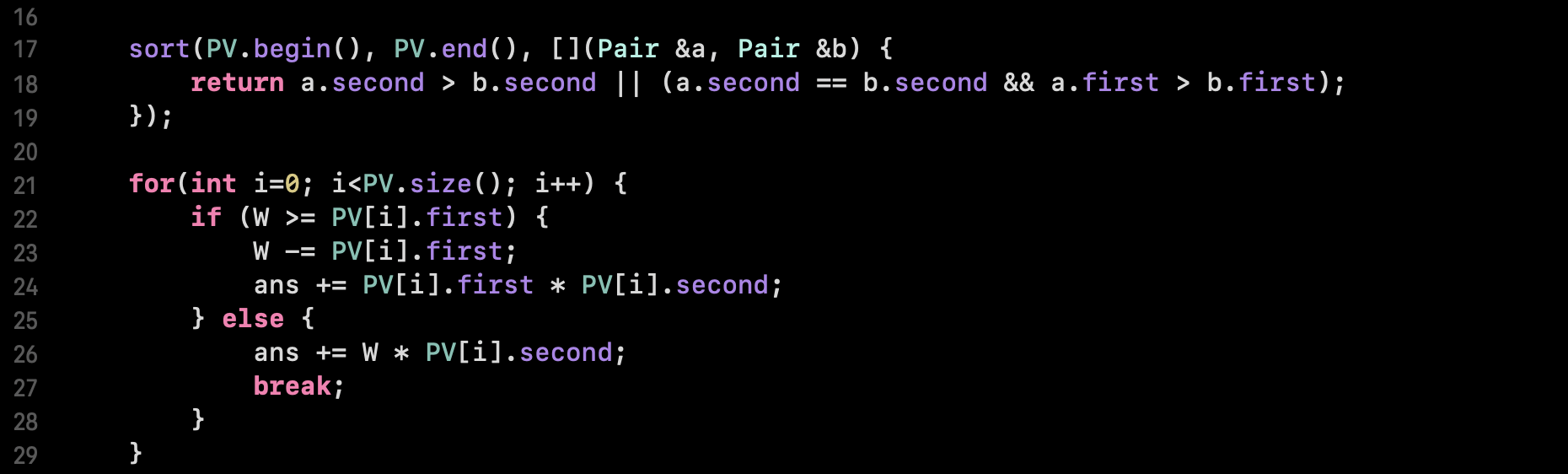 sort(PV.begin(), PV.end(), [](Pair &a, Pair &b) {