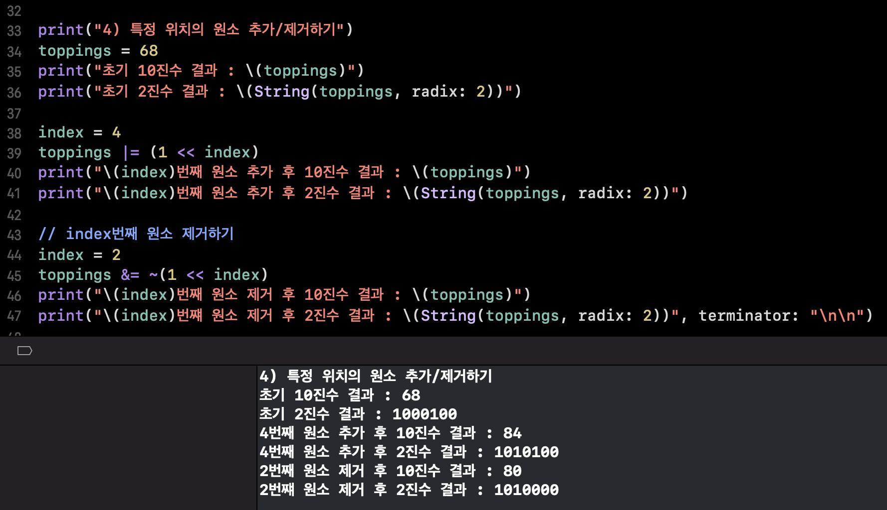 print("\(index)번째 원소 추가 후 2진수 결과 : \(String(toppings, radix: 2))", terminator: "\n\n")