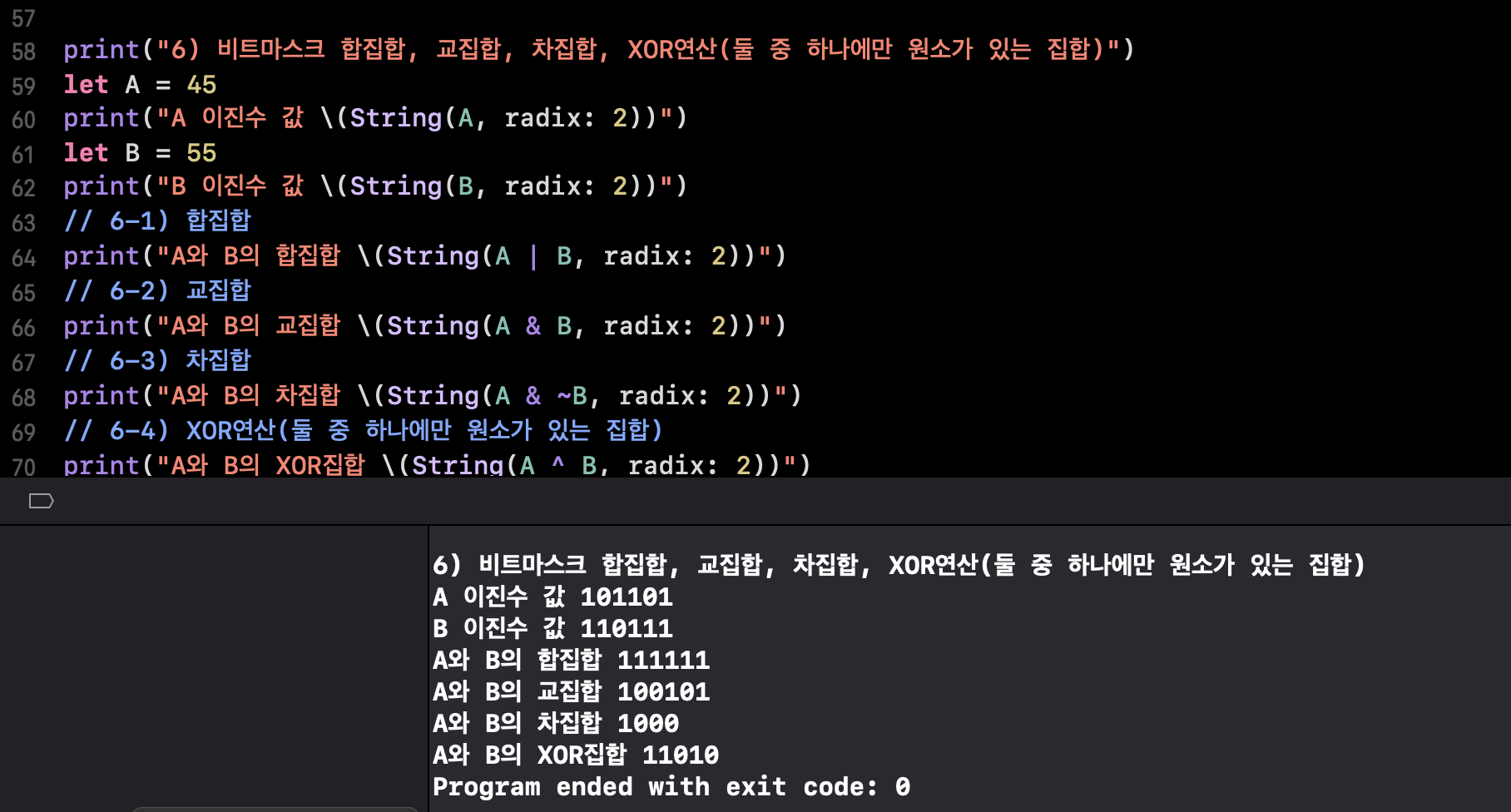 print("A와 B의 차집합 \(String(A & ~B, radix: 2))")