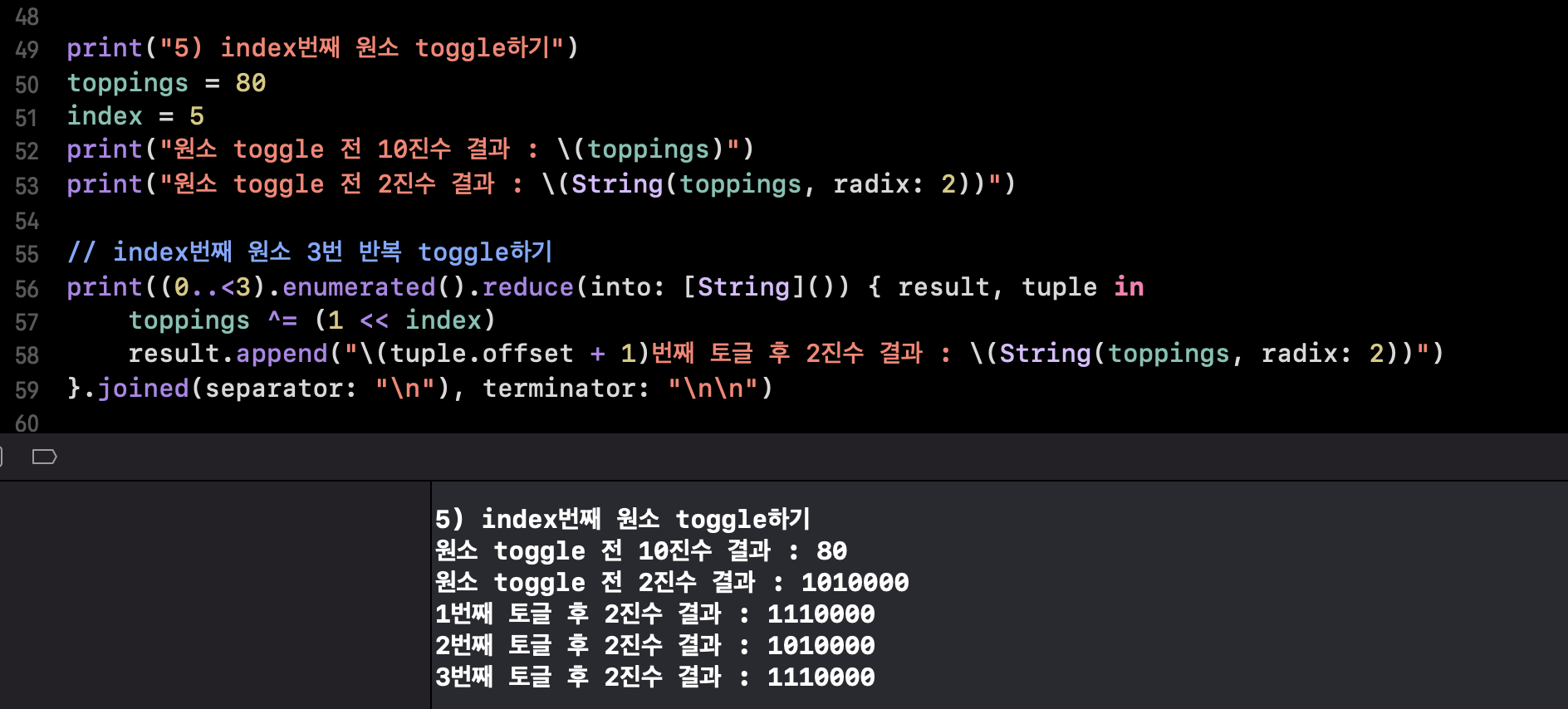 result.append("\(tuple.offset + 1)번째 토글 후 2진수 결과 : \(String(toppings, radix: 2))")