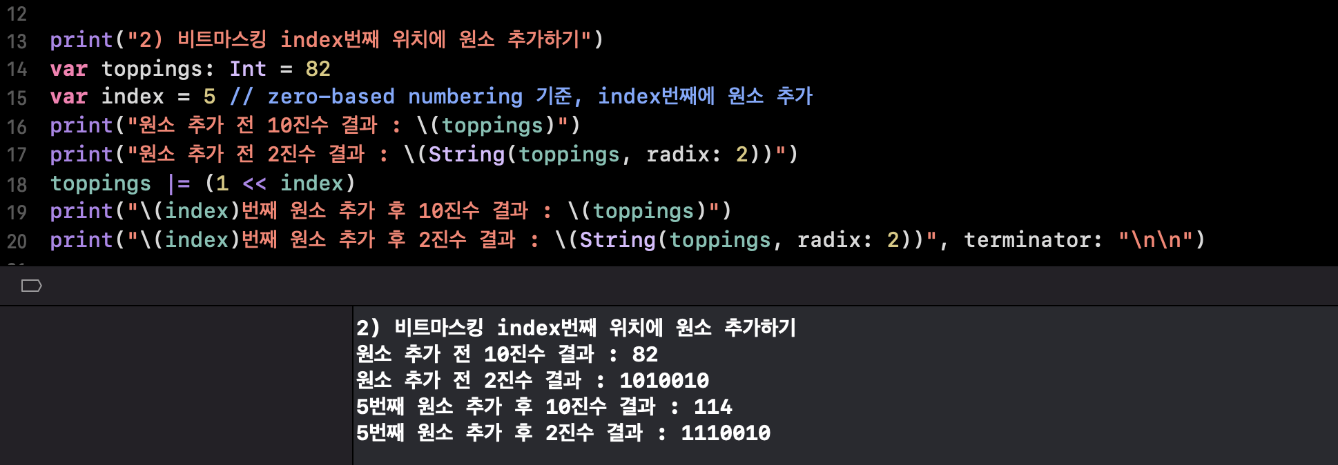 print("\(index)번째 원소 추가 후 2진수 결과 : \(String(toppings, radix: 2))")