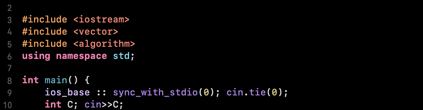 헤더를 먼저 추가합니다. cpp 표준입출력 헤더, vector 헤더를 추가했습니다. 본 문제에서 사실 algorithm 헤더는 필요하지 않습니다.