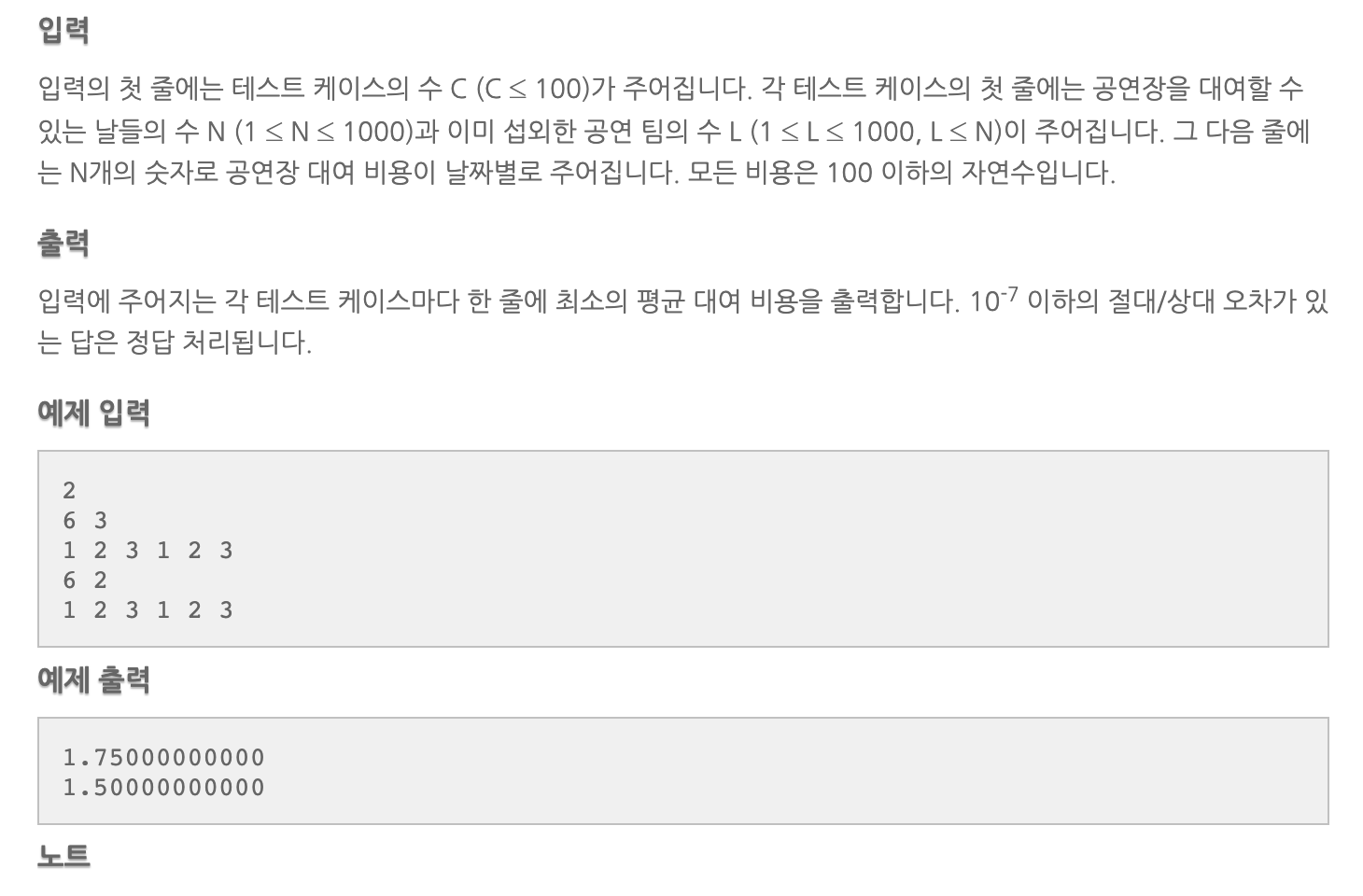 요약하자면, 이미 섭외한 팀의 수 이상으로 연속으로 공연장을 빌려야합니다. 공연장을 빌리는 비용은 날마다 상이합니다. 예를 들면, 섭외한 팀이 3명일 경우, 3일 이상(4, 5일도 가능) 공연장을 빌렸을때, 가장 최소한의 평균비용을 내는 경우를 찾는 문제입니다.