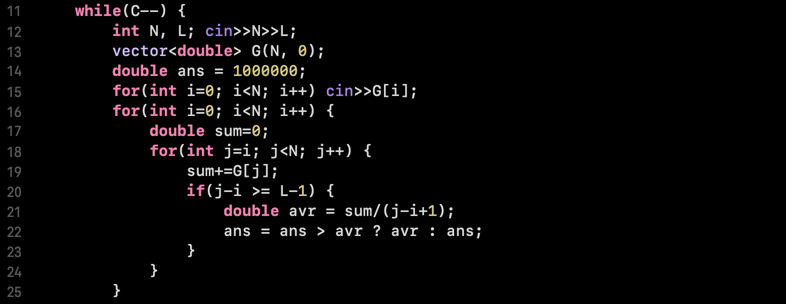0 ~ N 범위의 날 들을 하나하나 탐색하며 처음 공연장을 대여하는 시작점이 i인 모든 경우의 수를 돌려봅니다. 이때 최소 대여일이 K ~ 시작점으로 최대한 빌리는 경우까지 모두 확인하여 모든 경우의 수에 대한 최소 평균 공연장 대여비용을 구합니다. 이때 평균 비용은 반드시 소수점 7자리 이상을 연산 가능한 double 타입 연산을 수행해주었습니다.