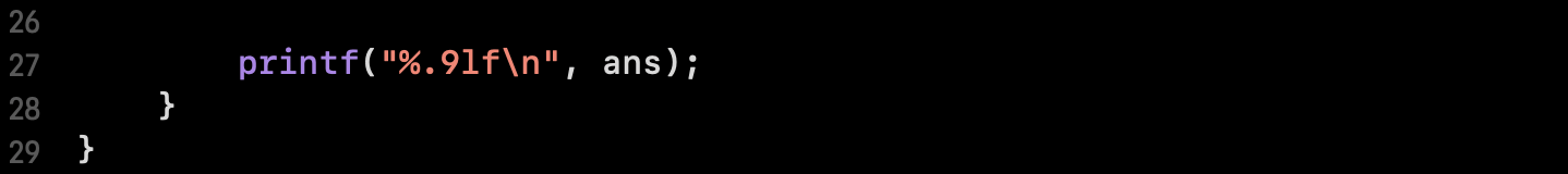 주의 할 점은, 해당 문제는 소수점까지 판별을 하며, 소수점 7자리 까지는 연산결과를 출력해주어야 문제없이 통과할 수 있습니다. 그럼 바로 cpp 언어로 문제 풀어보겠습니다.