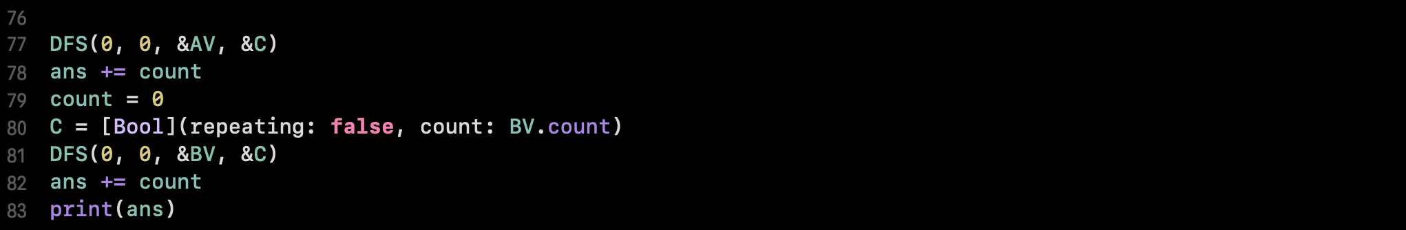 func DFS(_ bdx: Int, _ cnt: Int, _ V: inout [(Int, Int)], _ C: inout [Bool]) {