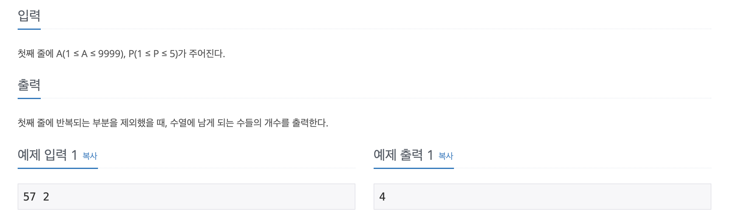 생성되는 수열의 연산 규칙은 위 내용을 참고 바랍니다. A라는 숫자로부터 시작해서 각자리의 숫자를 P번 제곱한 합을 다음 수열 값으로 이어가면서 반복수열을 확인하고, 반복되는 수열 이전의 수열길이를 출력하면 되는 문제입니다.