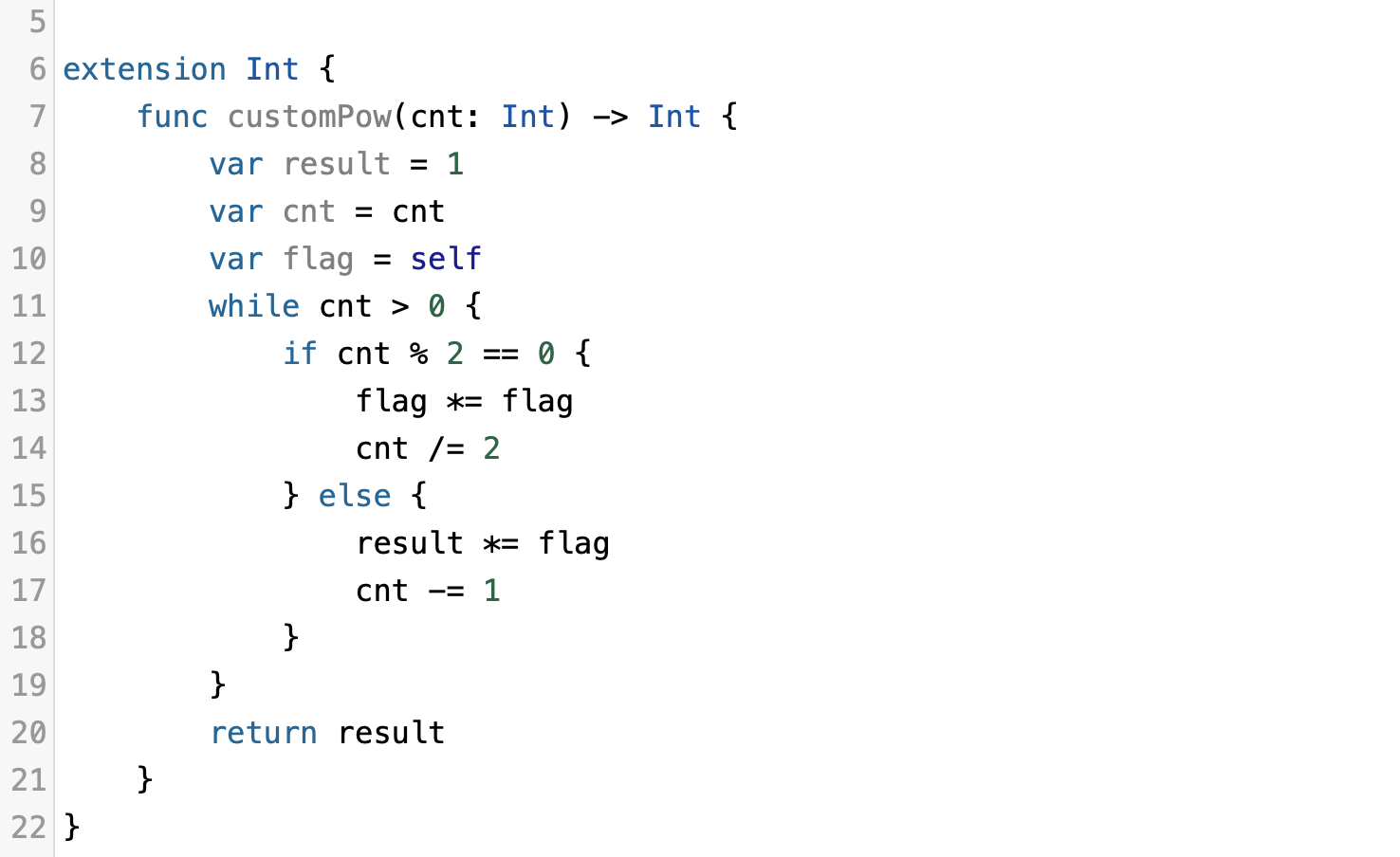 Int 익스텐션 함수를 만들어봤습니다. 그냥 기본 클로져, 함수 등으로 구현해서 사용해도 무방합니다. 거듭제곱 알고리즘을 활용해서 O(logN)의 시간복잡도 특정 제곱 결과값을 반환해주는 메서드를 구현했습니다.