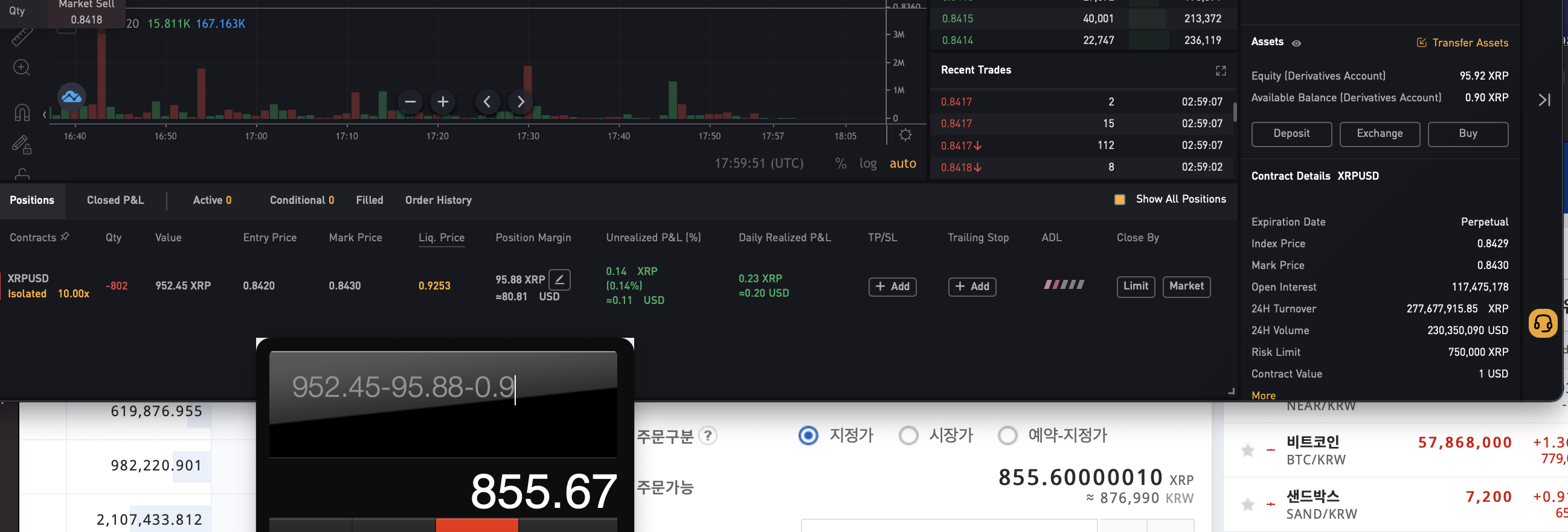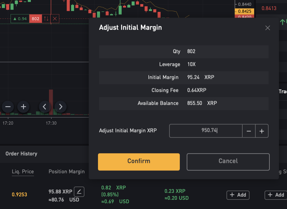 마저 옮긴 리플물량까지 선물지갑으로 옮긴 후, Position Margin 추가해주세요. 이때 체결한 숏물량과 동일한 리플물량을 Position Margin에 추가하면 청산가가 비정상적으로 올라가면서, 10배 레버리지로 설정되어있어도 강제청산 리스크가 없게 됩니다.