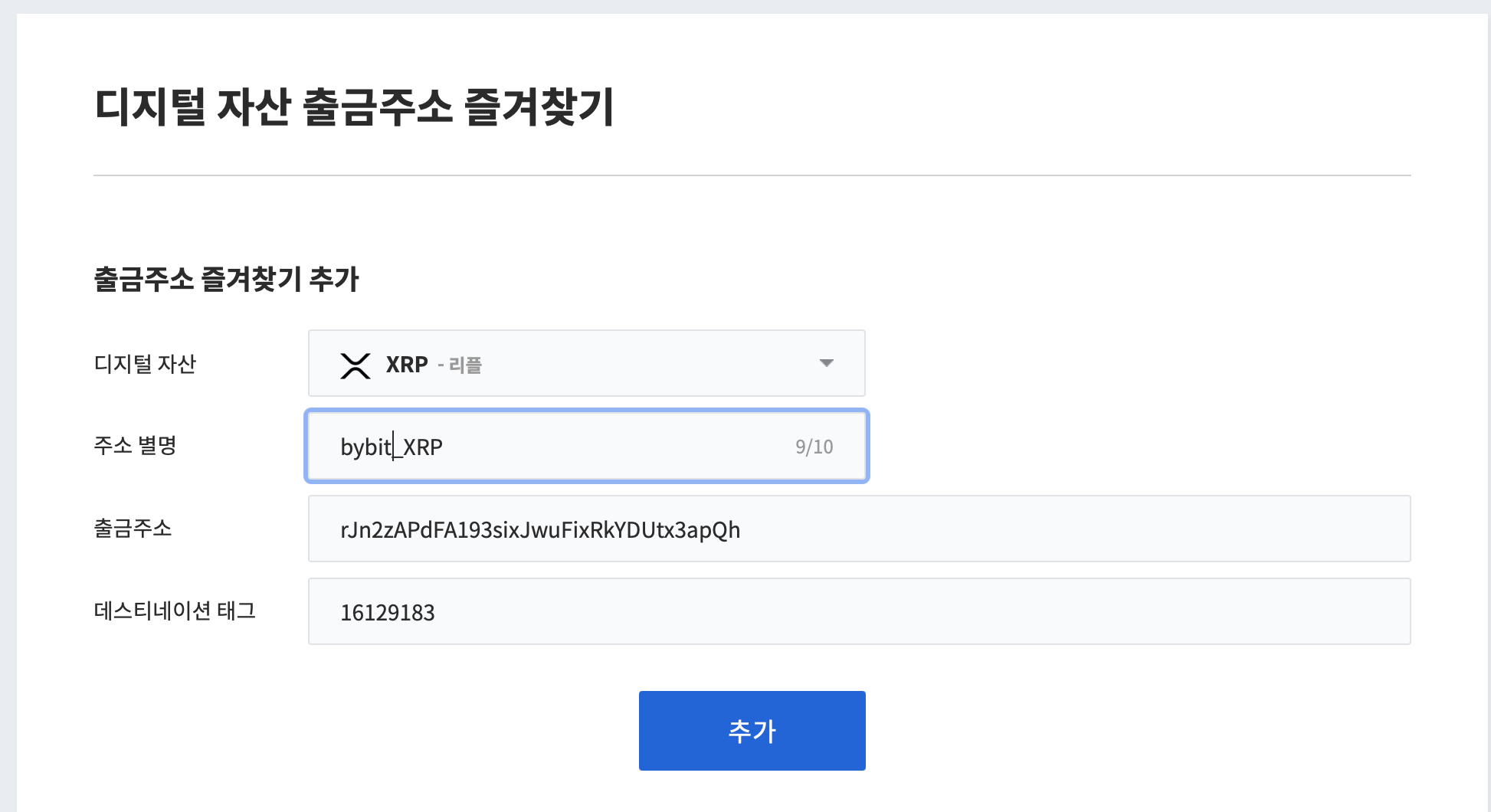 개인 바이비트 계정의 리플 입금주소를 확인 후, 국내 거래소인 업비트의 출금주소 즐겨찾기에 등록을 해줍니다. 오입금 방지를 위해 업비트거래소에서 출금 전, 출금주소 즐겨찾기를 반드시 하는게 좋습니다.