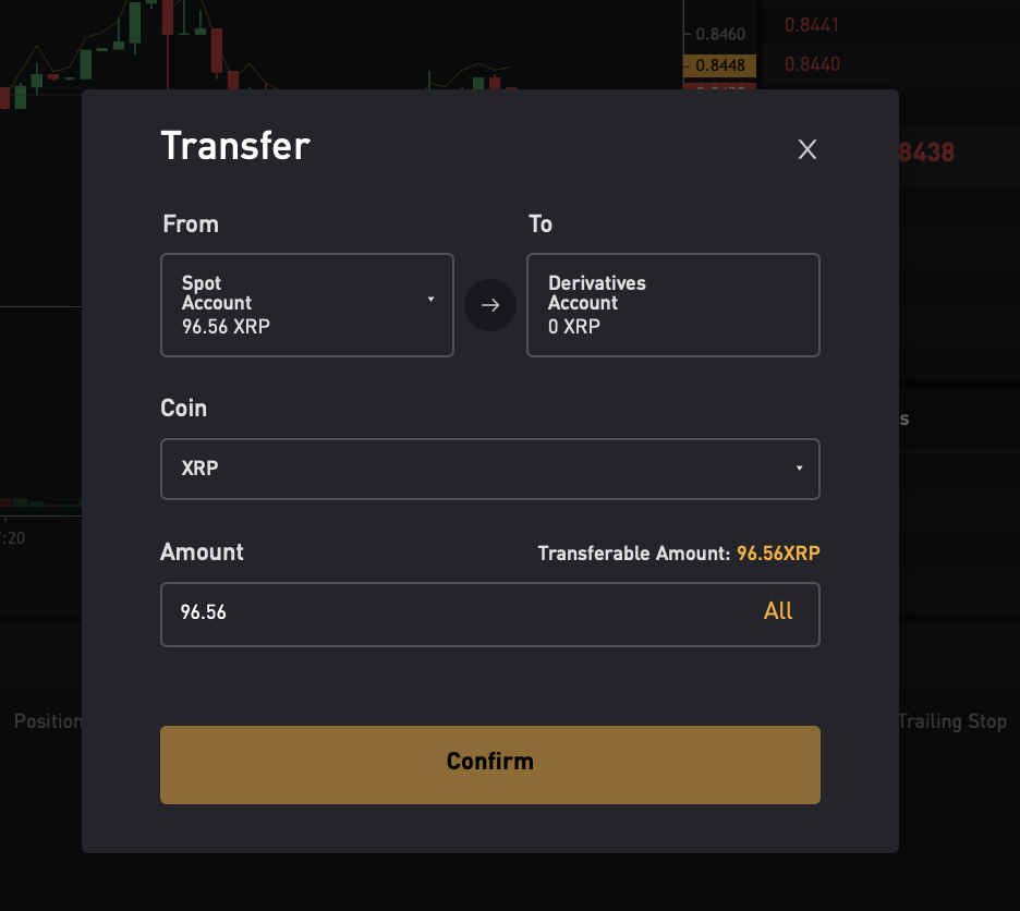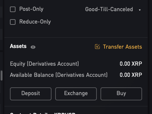Derivatives > Inverse Perpetual을 선택 후, XRPUSD종목을 선택합니다. 이제 이 페이지 우측의 Transfer Assets 문구를 선택해서 리플을 선물지갑에 옮깁니다.