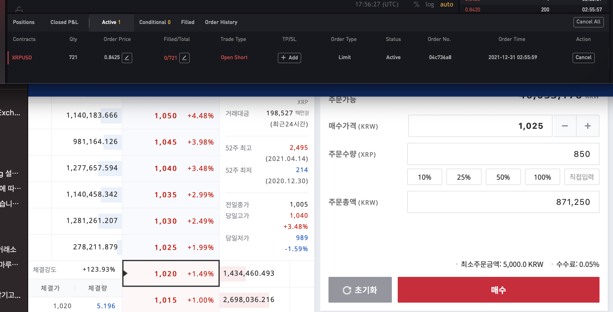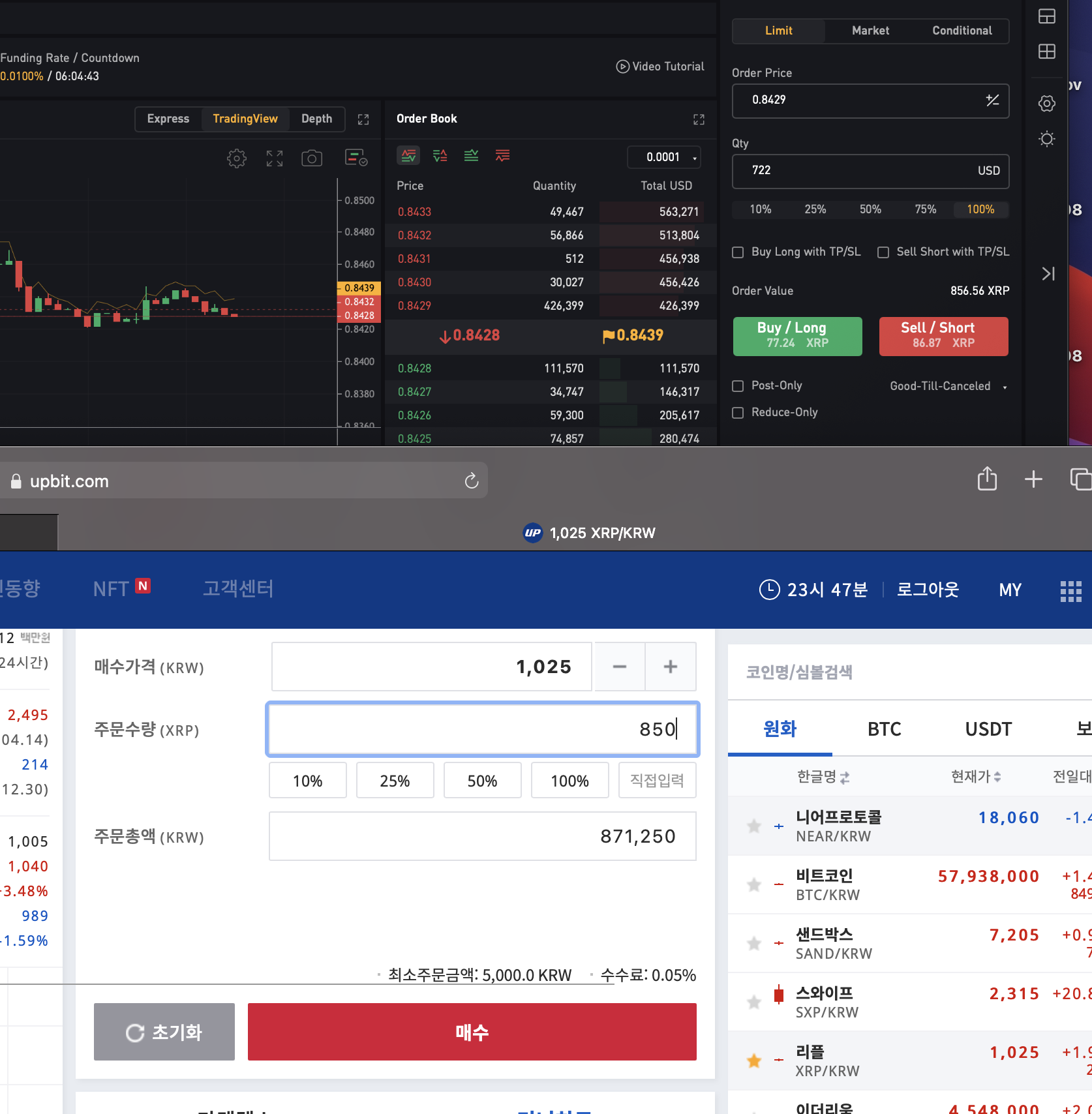 체결가능 수량보다 살짝 적게, 바이비트에서 850개의 리플물량을 숏으로 체결함과 동시에, 업비트에서 850개의 리플을 현물매수합니다.