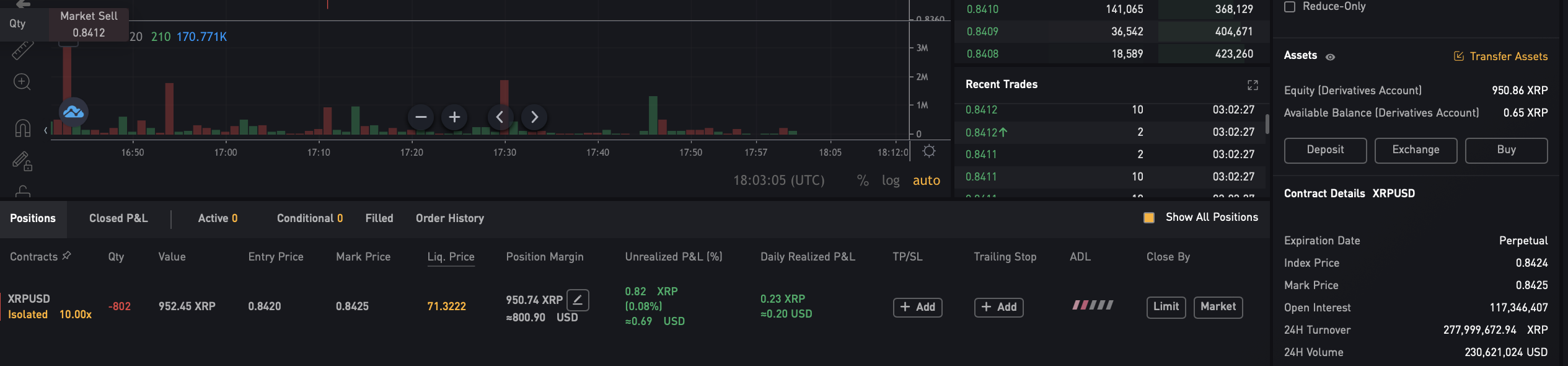 선물에는 Cross(교차), isolated(격리)의 두가지 방식이 있는데, 이번 포스팅은 격리방식을 사용하겠습니다. 또한 1.00x로 배율을 맞춰주세요. 1배숏 설정이 되었다면, 현재 입금한 리플코인을 1배숏 체결을 진행합니다. 호가를 선택하고, Sell/Short 버튼을 눌러준 후, 체결을 시켜줍니다.
