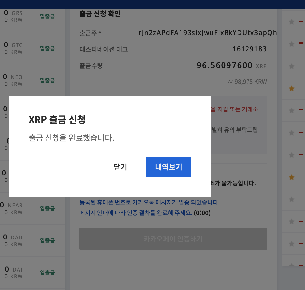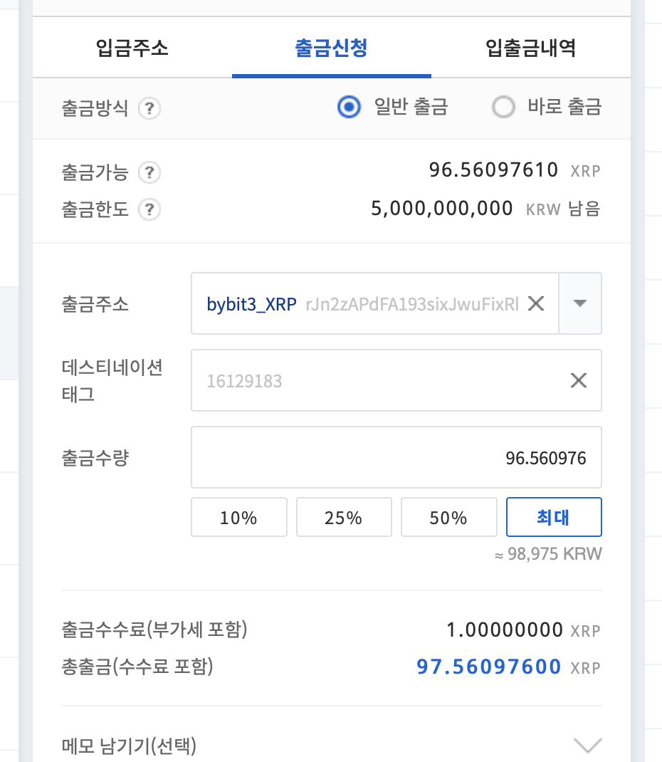 XRP코인을 앞서 등록한 즐겨찾기를 활용해서 출금주소 설정 후 출금을 진행합니다. 그 후, 바이비트 거래소에 입금이 정상적으로 되었는지 확인합니다.