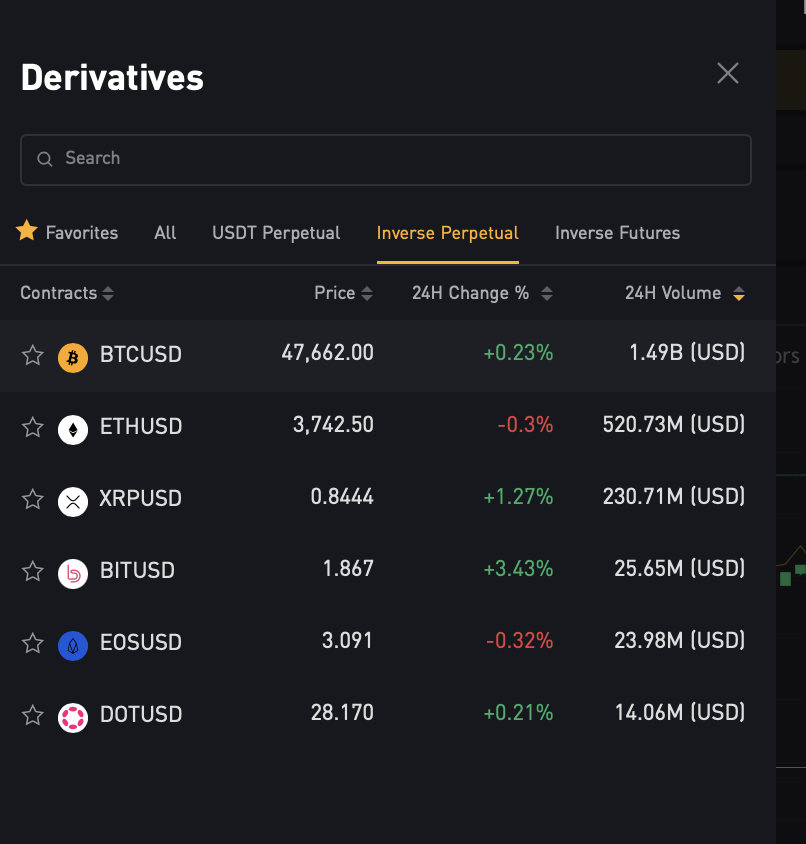 이제 앞서 입금받은 리플코인을 코인선물 지갑으로 전송해야합니다. 코인선물은 바이낸스의 경우 COIN-M, 바이비트는 Inverse Perpetual탭을 통해 사용하면 됩니다. 바이비트 Derivatives > Inverse Perpetual를 선택하세요.