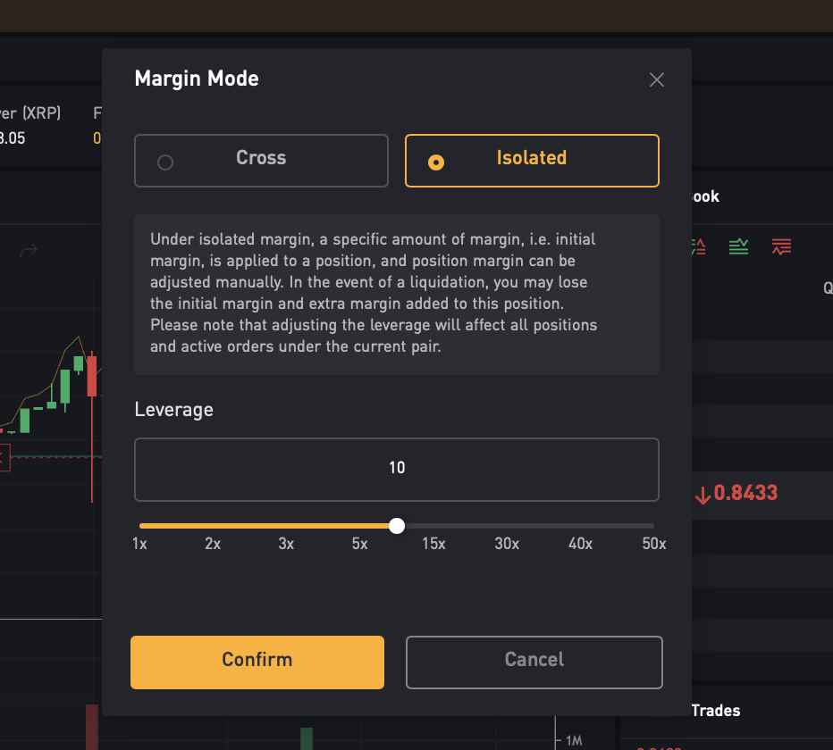 이제 업비트의 메인시드, 더 많은 시드를 옮길 준비가 되었습니다. 여기에서 1배 선물 레버리지를 10배 레버리지로 수정 후, Confirm 버튼을 눌러줍니다.