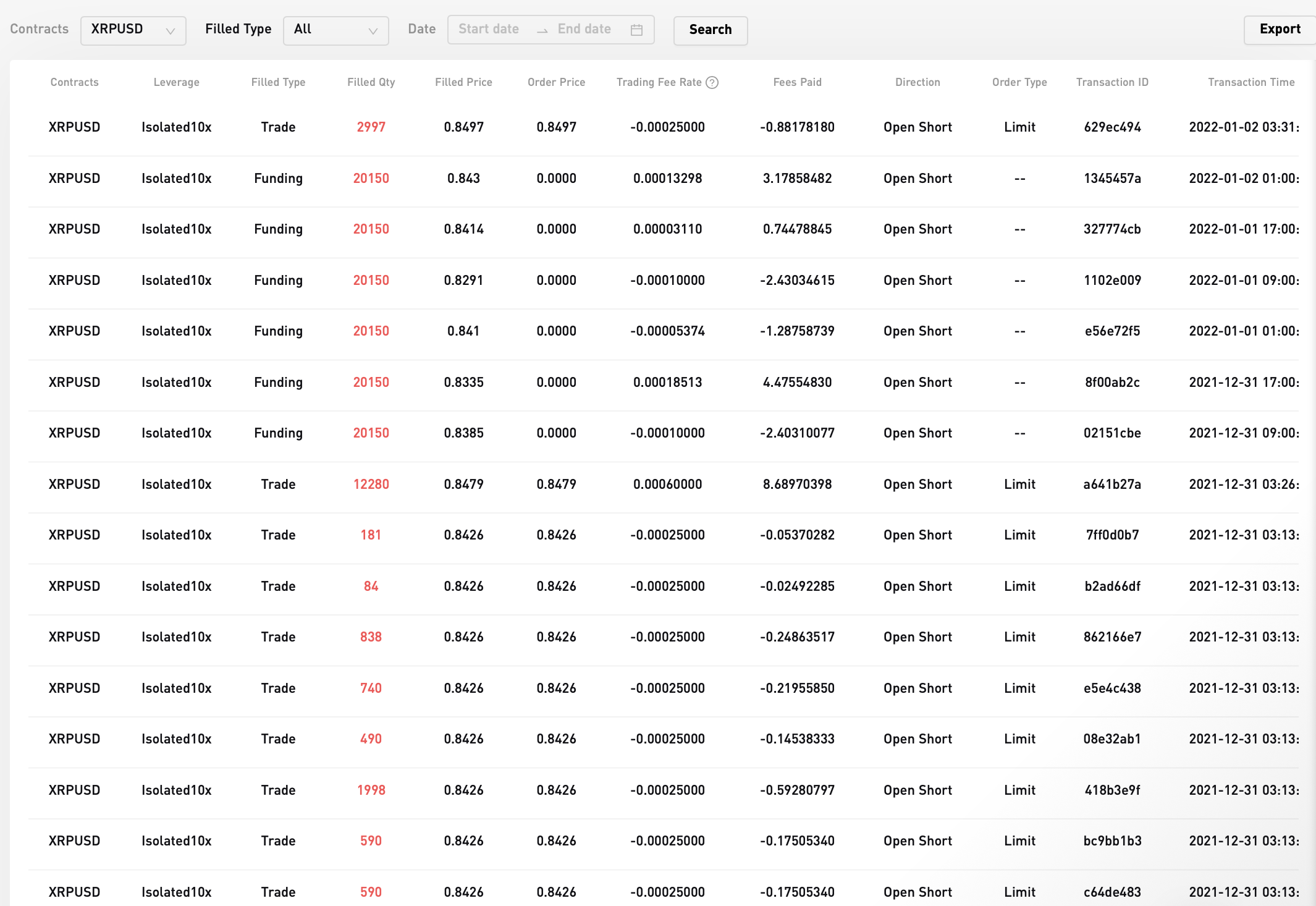 그렇게 "Search" 버튼을 누르면 위와 같이 체결내역을 확인할 수 있습니다. Filled Type을 보면 각각의 내역이 어떤 체결내역인지 확인할 수 있습니다.