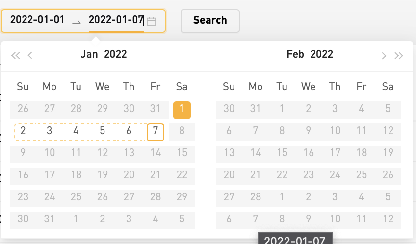 본인의 체결내역을 특정 기간으로 한정해서 열람알 수 있습니다. 달력의 날짜를 선택해서 from 기간, to 기간을 설정해준 후, 우측의 Search 버튼을 선택해줍니다.