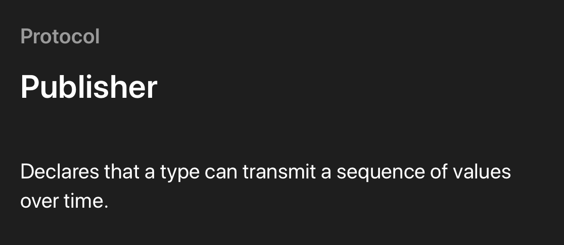 - Publisher는 시간상 일련의 값들을 내보낼 수 있는 타입으로 protocol로 선언되어있습니다.
