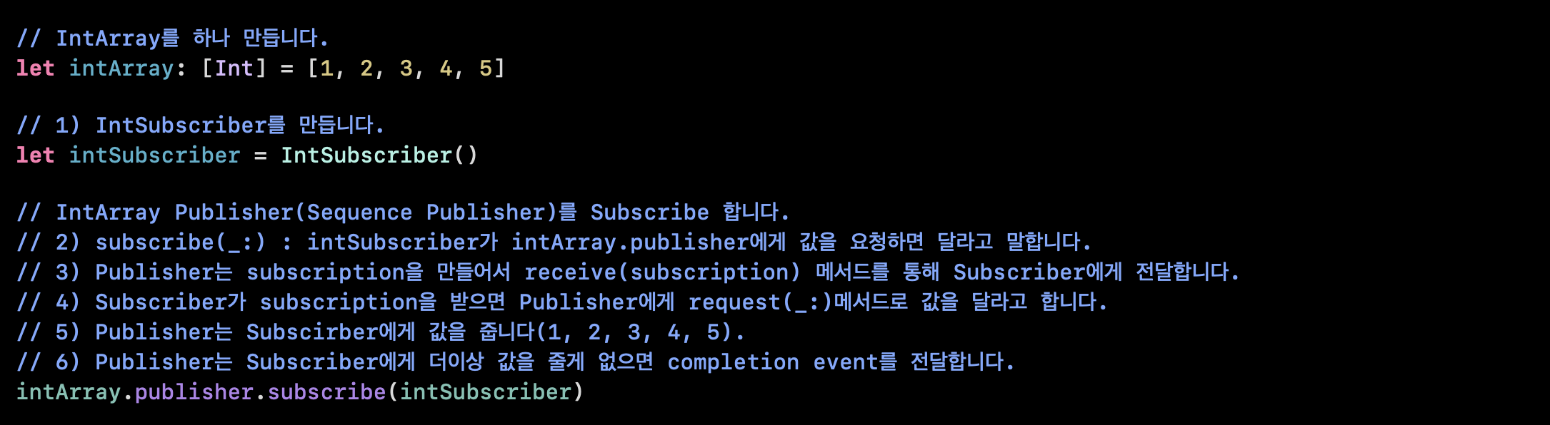 배열 상수의 instance property로 publisher가 존재합니다. 해당 프로퍼티를 intArray에 대한 Sequence Publisher로서 사용이 가능합니다. 이어서 subscribe 메서드와 인자로 앞서 선언한 intSubscriber를 사용하여 구독을 진행할 수 있습니다.