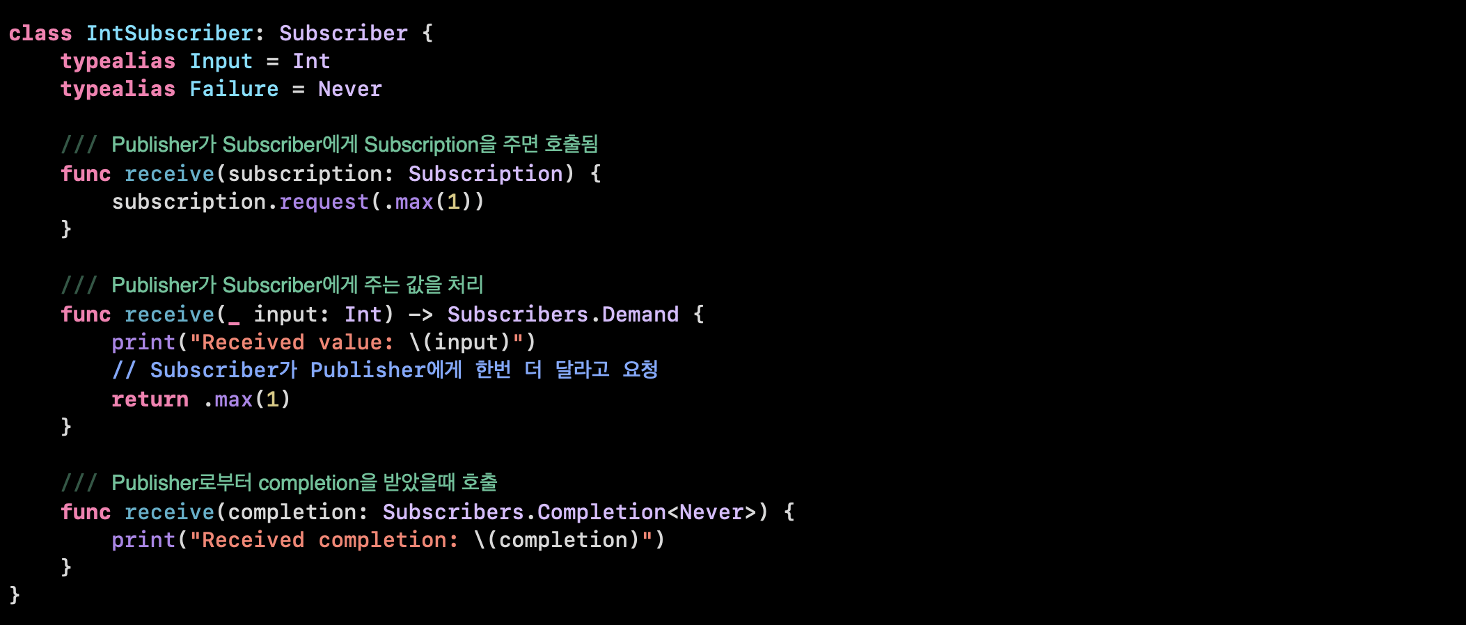 위 코드는 Int형 값을 방출하는 IntSubscriber라는 클래스의 구현코드입니다. 해당 클래스는 Subscriber의 역할을 하기 위해 Subscriber 프로토콜을 채택하여 사용하고 있습니다.