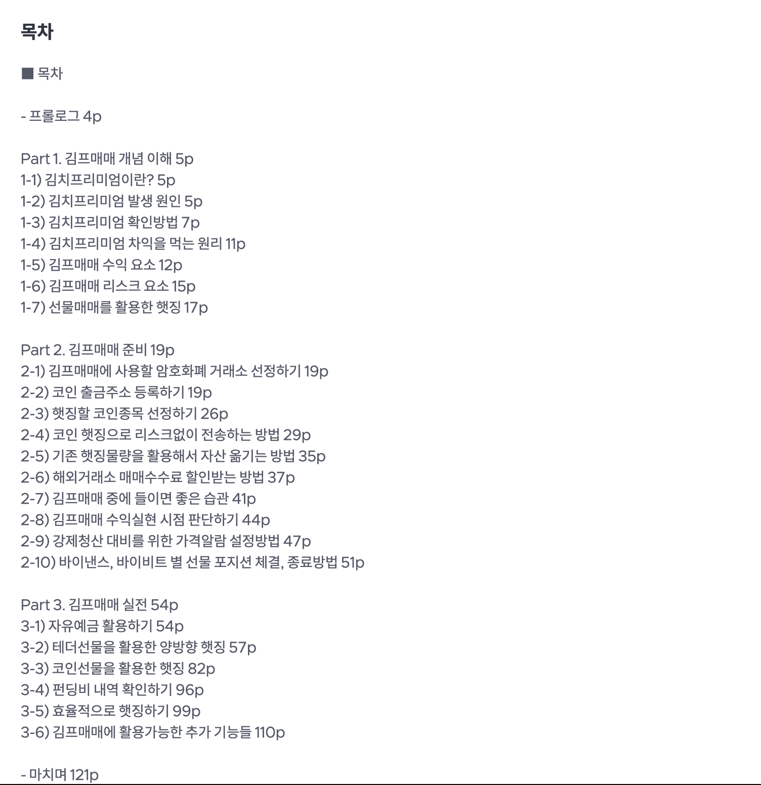 제가 등록한 전자책 내용은 김프매매라(김치프리미엄 차익 매매)는 코인 재테크 전략이 주제입니다. 직접 이것저것 경험해보면서 알게 된 재테크 전략 노하우를 담아서 전자책까지 쓸 수 있게 되었어요.