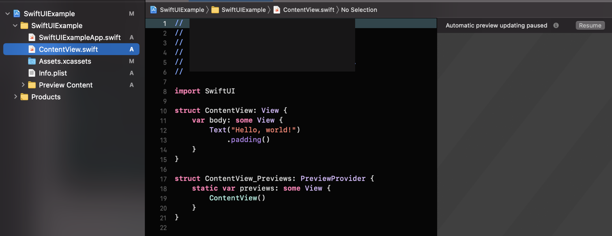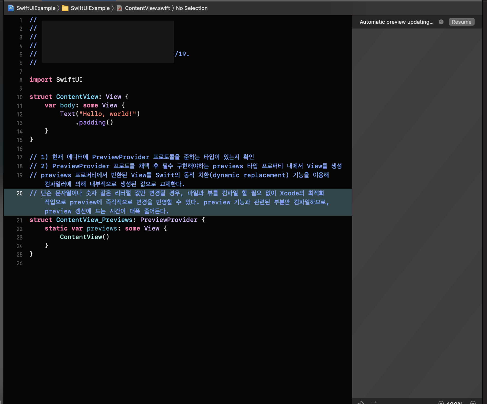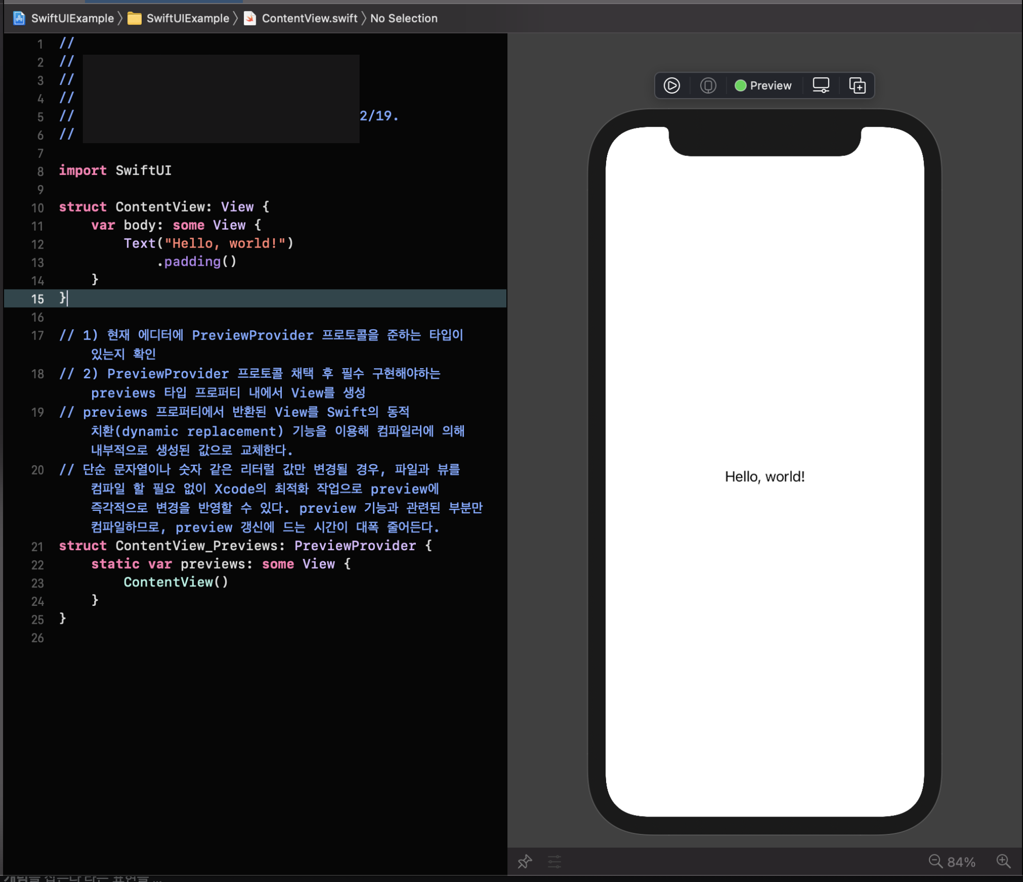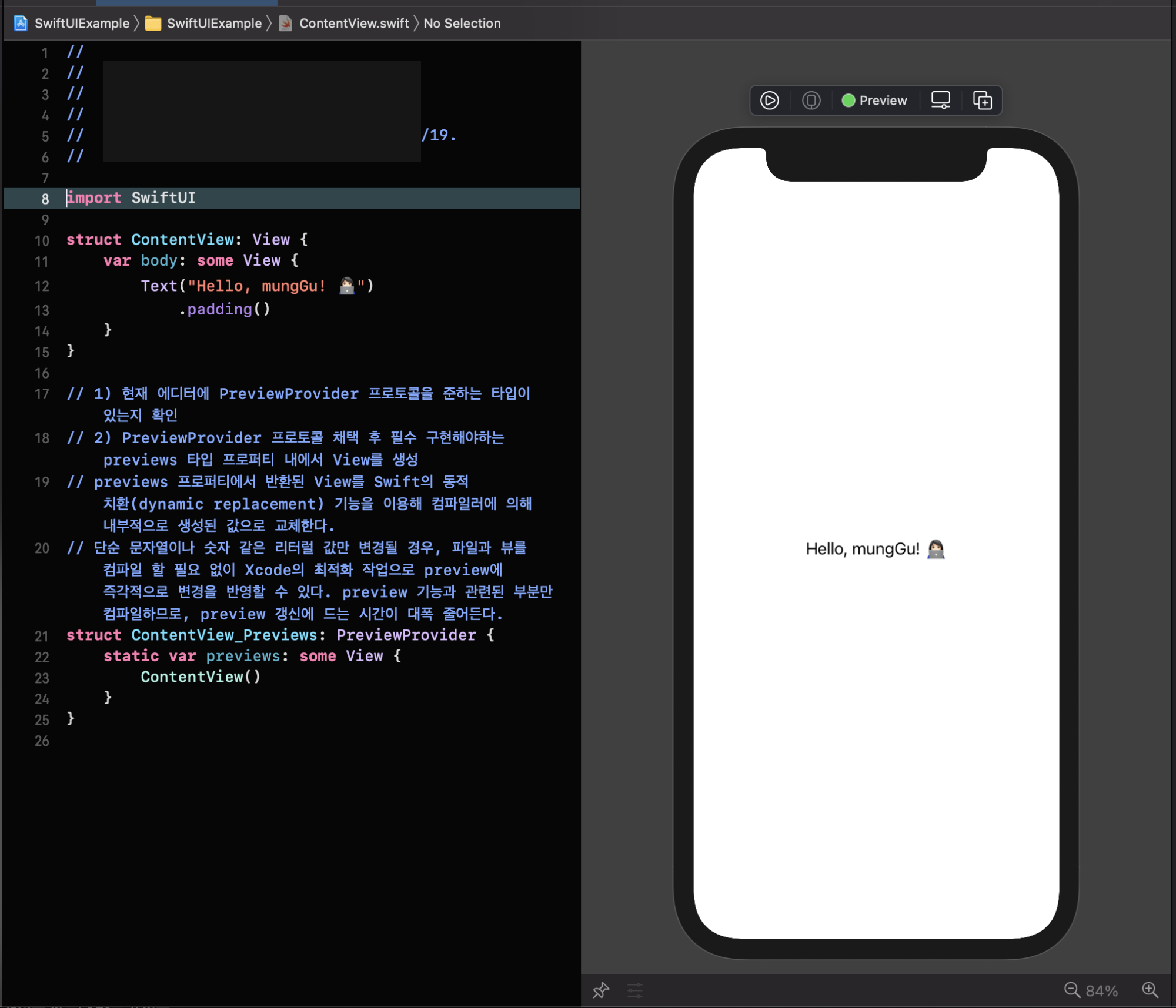 초기 생성된 프로젝트에서 수동으로 추가할 필요업이 PreviewProvider 프로토콜을 준수하는 ContentView_Previews 구조체가 존재하고, 그 안에서 정의된 previews 타입 프로퍼티 내에서 ContentView() 를 정의해두었기 때문에, 이 상황에서 별도 코드를 추가할 필요 없이 Preview 기능을 사용할 수 있습니다.