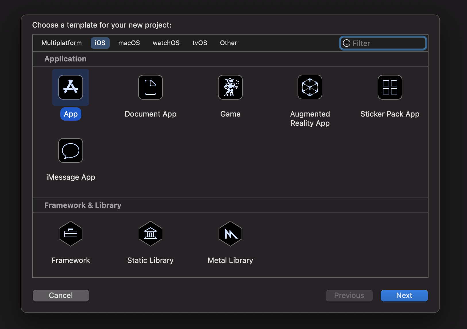먼저 프로젝트를 생성해야겠죠? Xcode를 실행하고, Command + Shift + N 단축키를 눌러숩니다. 이후 iOS -> "App" 메뉴를 선택해주세요.