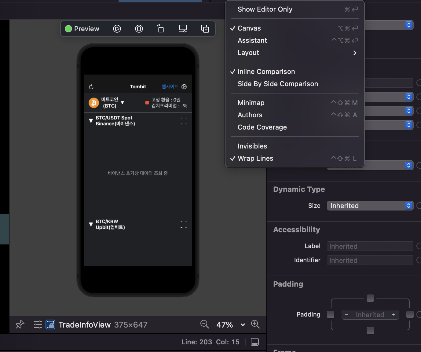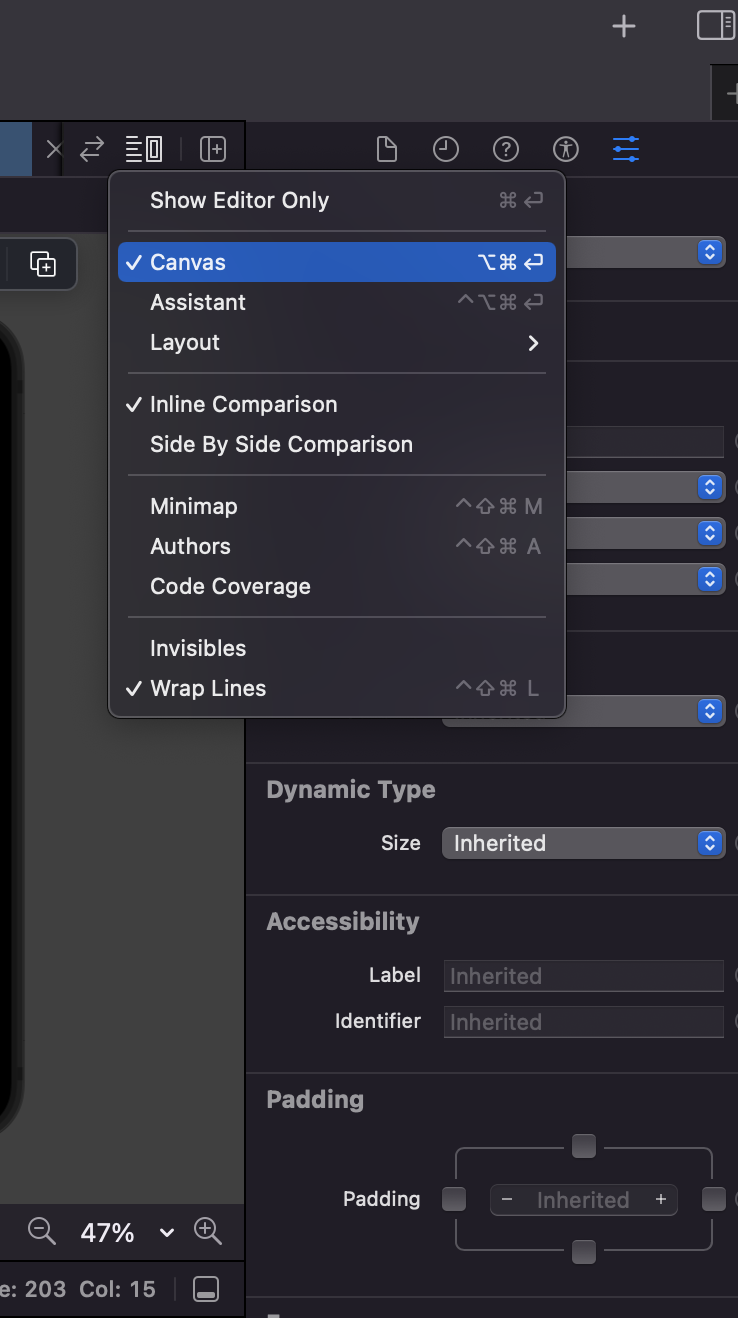 단축키를 사용했는데도 preview 창이 안나오는 경우에는 에디터 설정상태를 확인해보세요. Xcode 우상단을 확인해보세요. 위 메뉴에서 Canvas를 선택하시면 preview 페이지를 확인하실 수 있을거에요. 아래는 위와 같이 설정 후, preview 단축키(Command + Option + P) 적용 화면입니다.