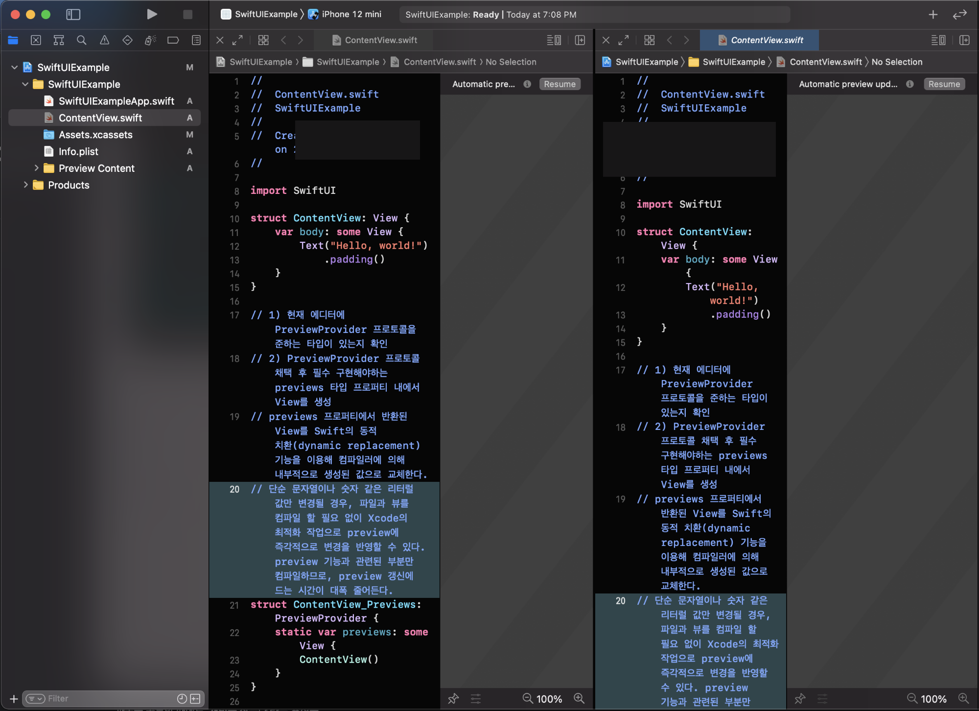 * Option 버튼을 누른채, 좌측 Project Navigator의 ContentView 파일을 선택하시면 위와 같이 다수의 에디터를 확인 가능합니다.