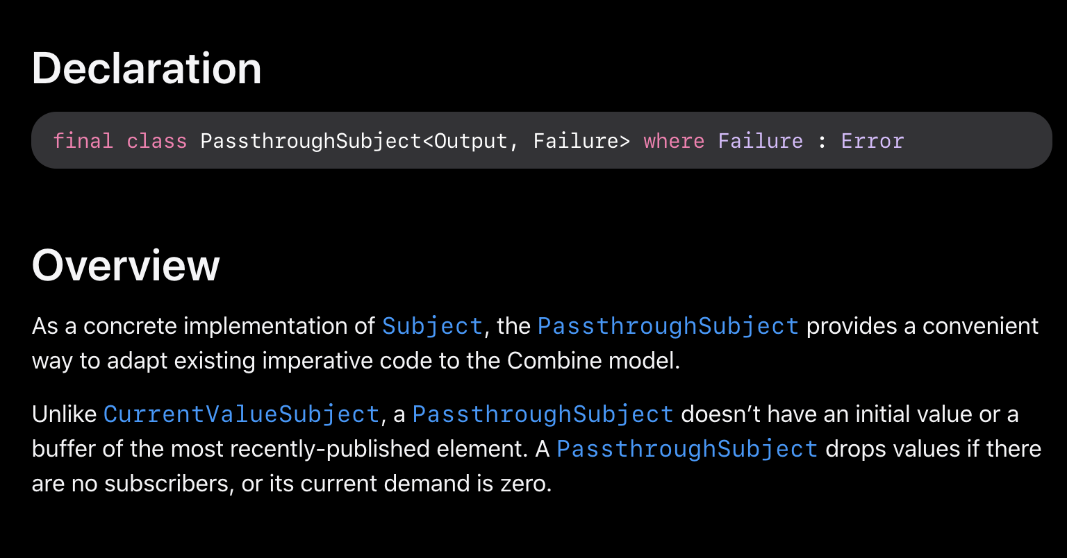 PassthroughSubject는 기존의 명령형 코드를 Combine 모델로 적용할때 편리한 방법을 제공해주는 Subject class입니다. 앞서 말했던것처럼 CurrentValueSubject와 다르게 PassthroughSubject는 최근 발행된 요소와 관련된 초기값이나 버퍼를 갖고있지 않습니다. 또한 만약 구독자가 없거나, demand값이 0일 경우, PassthroughtSubject는 값들을 버립니다.