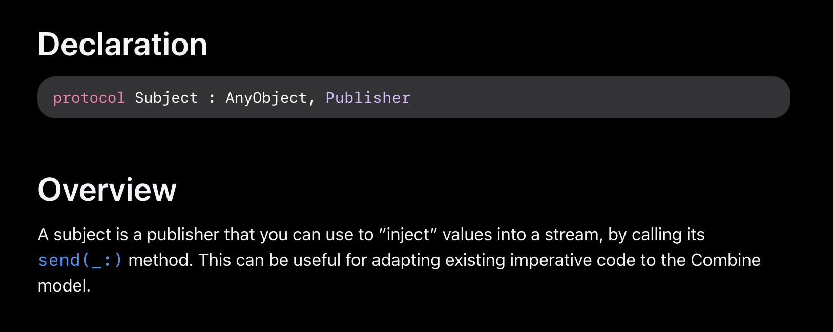 Subject는 send(_:) 메서드를 호출해서 stream에 값을 "주입"하기 위해 사용할 수 있는 Publisher입니다. 기존에 존재하는 명령형 코드를 Combine 모델에 적용하고자 할때 유용하게 사용가능합니다.